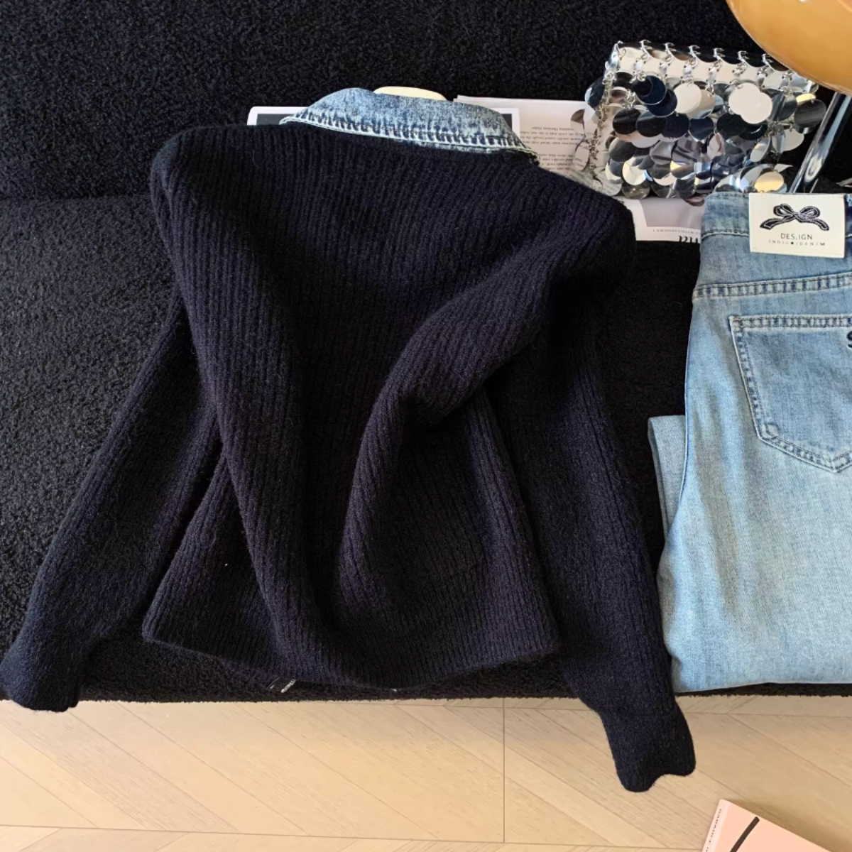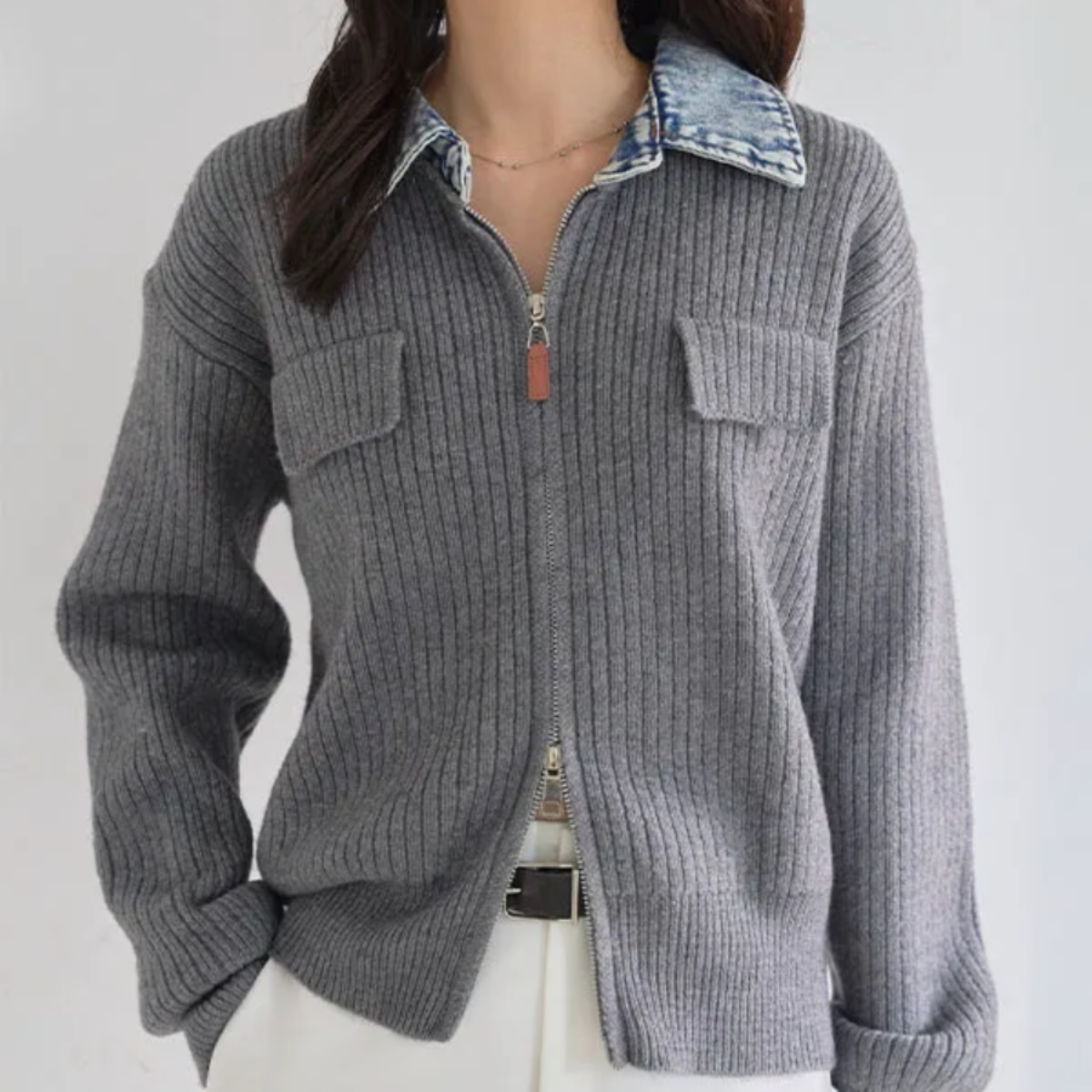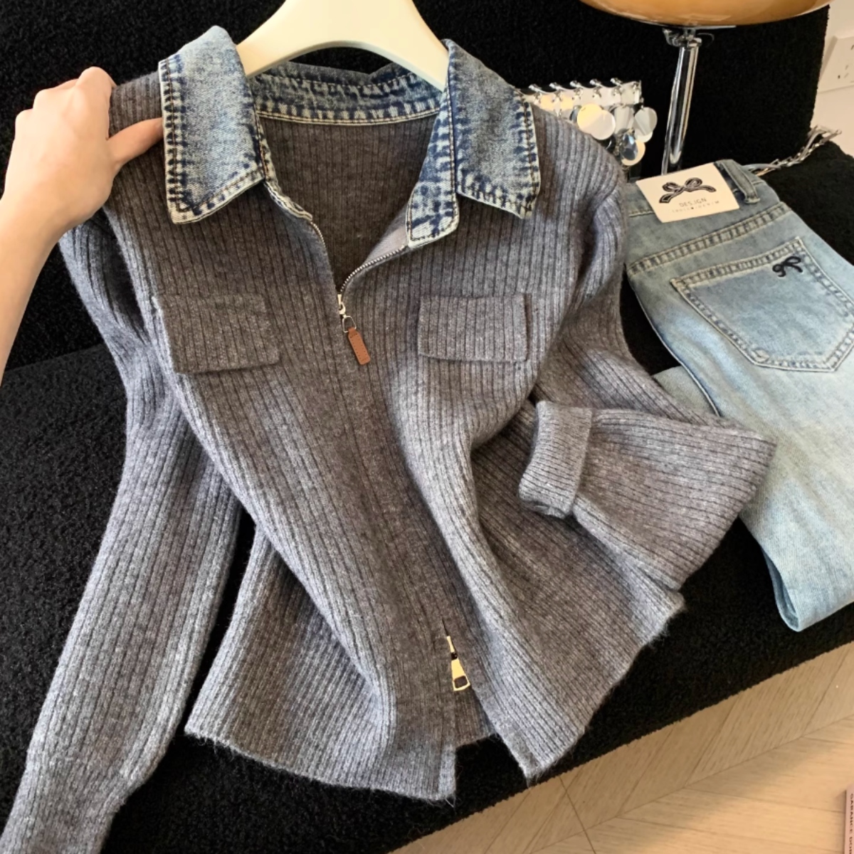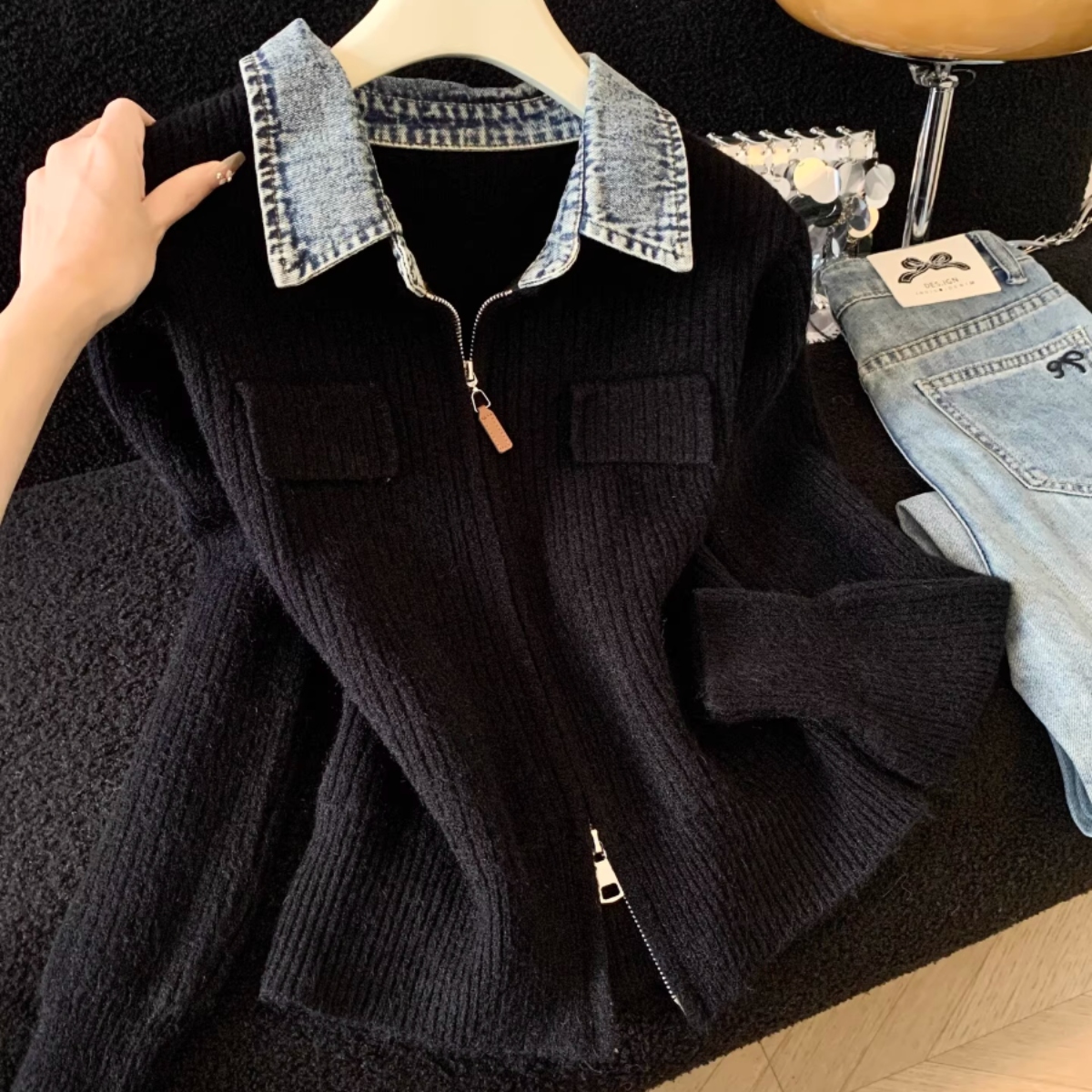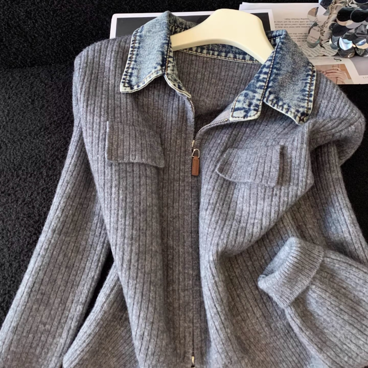 骨格ウェーブ デニム襟 ジップアップ ニットカーディガン