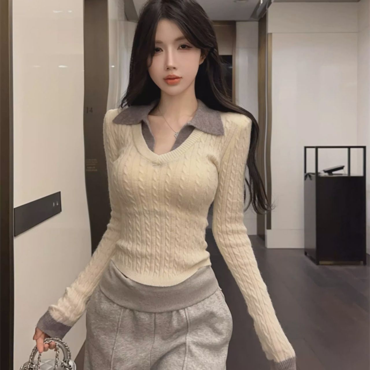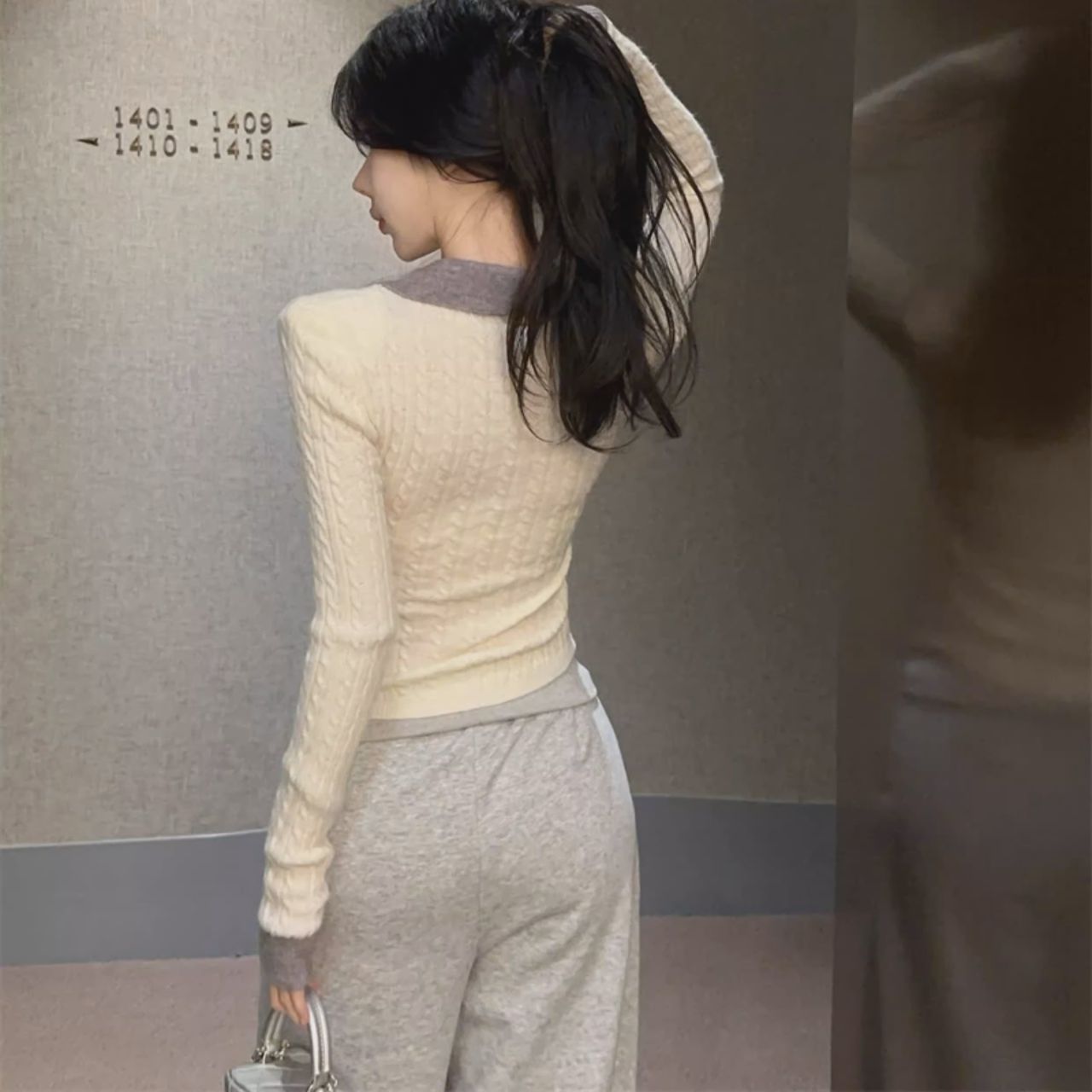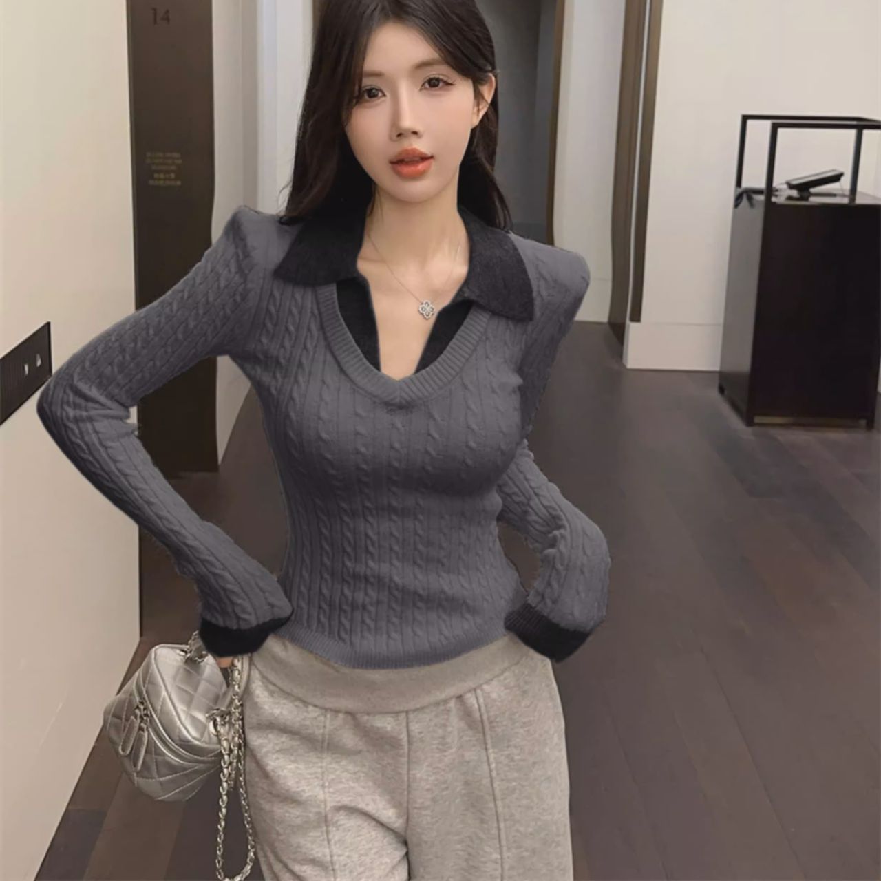 骨格ウェーブ レイヤード風ポロニット ケーブル編み