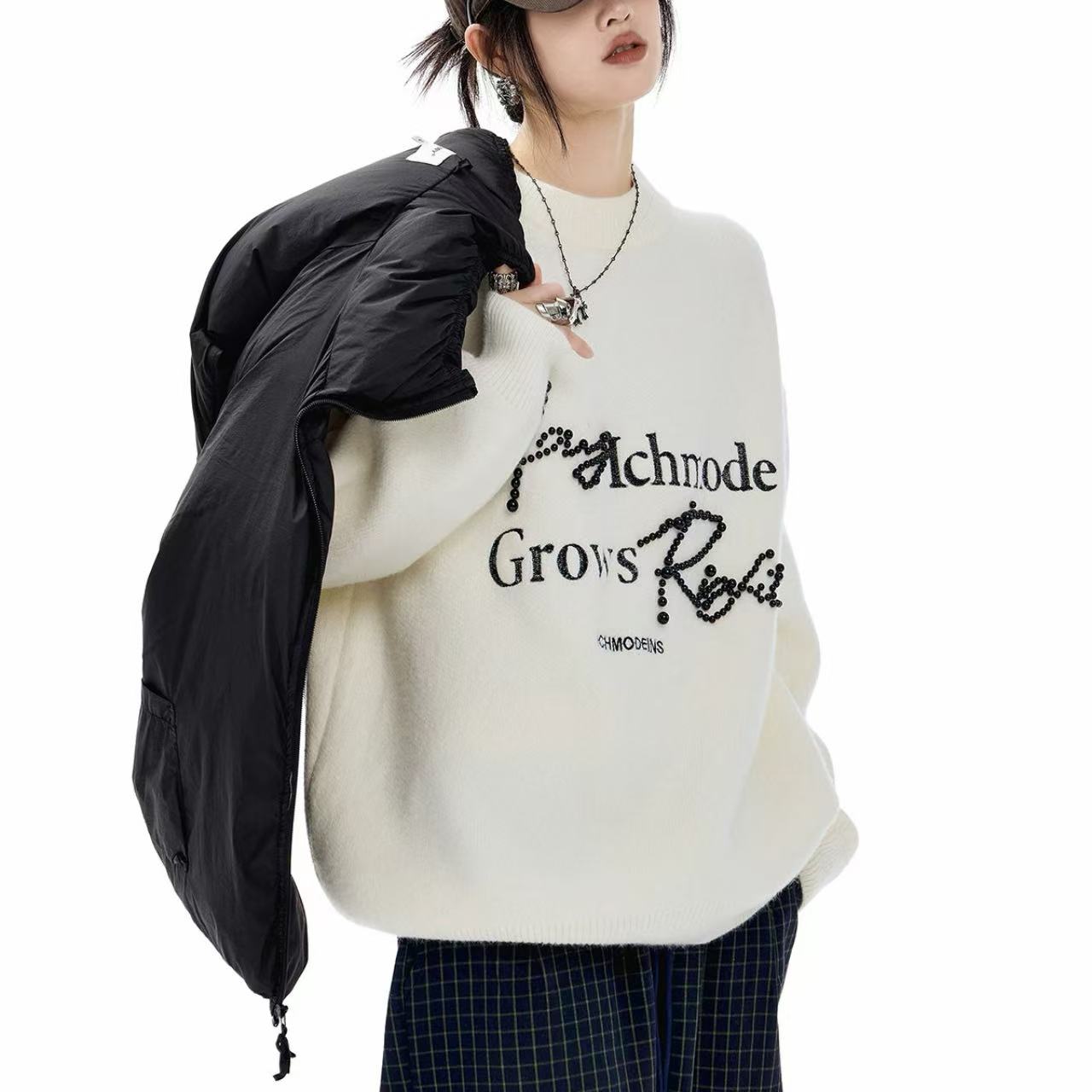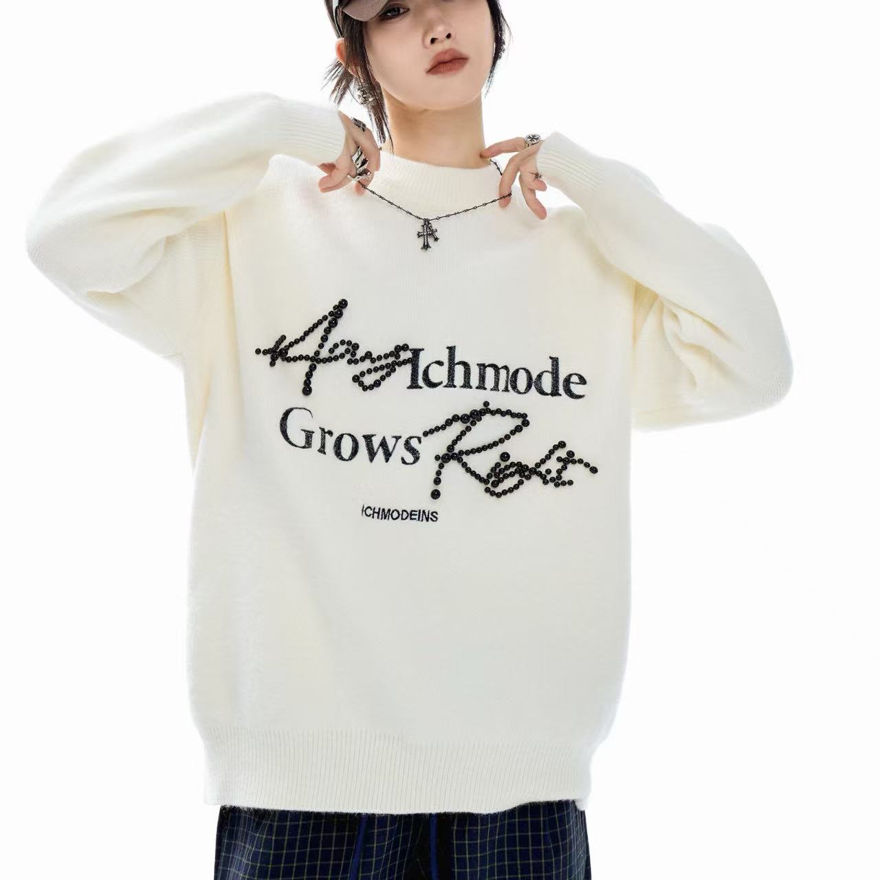 骨格ウェーブ ICH MODE アメリカンレトロ風 パール付きクルーネックセーター