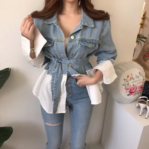 骨格ウェーブ ウエストマーク デニムシャツ レイヤード風