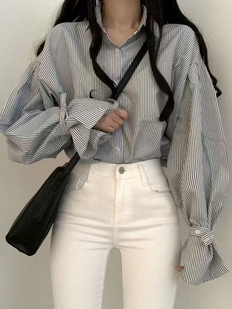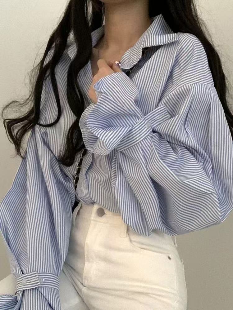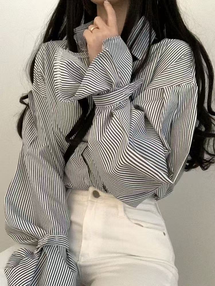 骨格ウェーブ ストライプシャツ ゆったりシルエット 韓国風シンプルデザイン