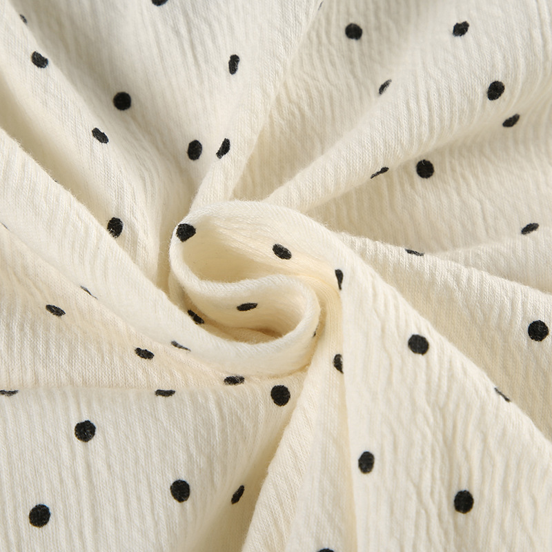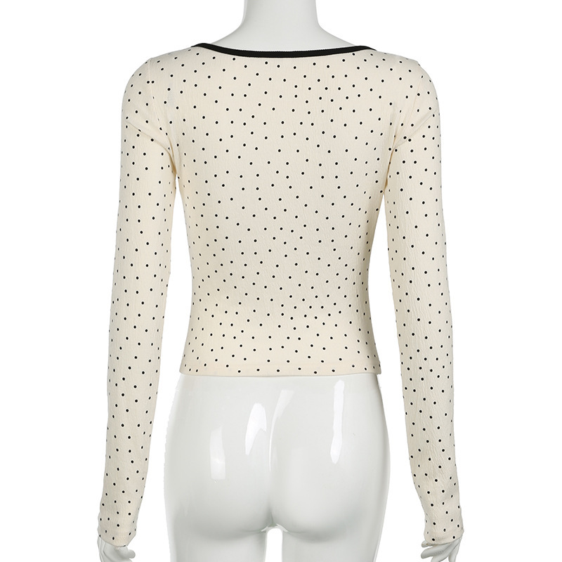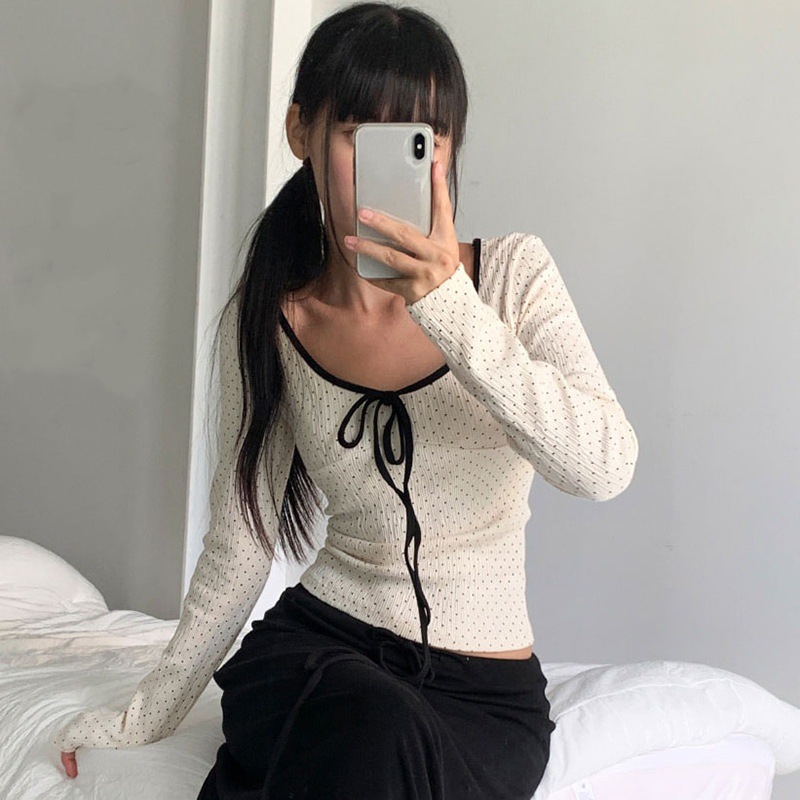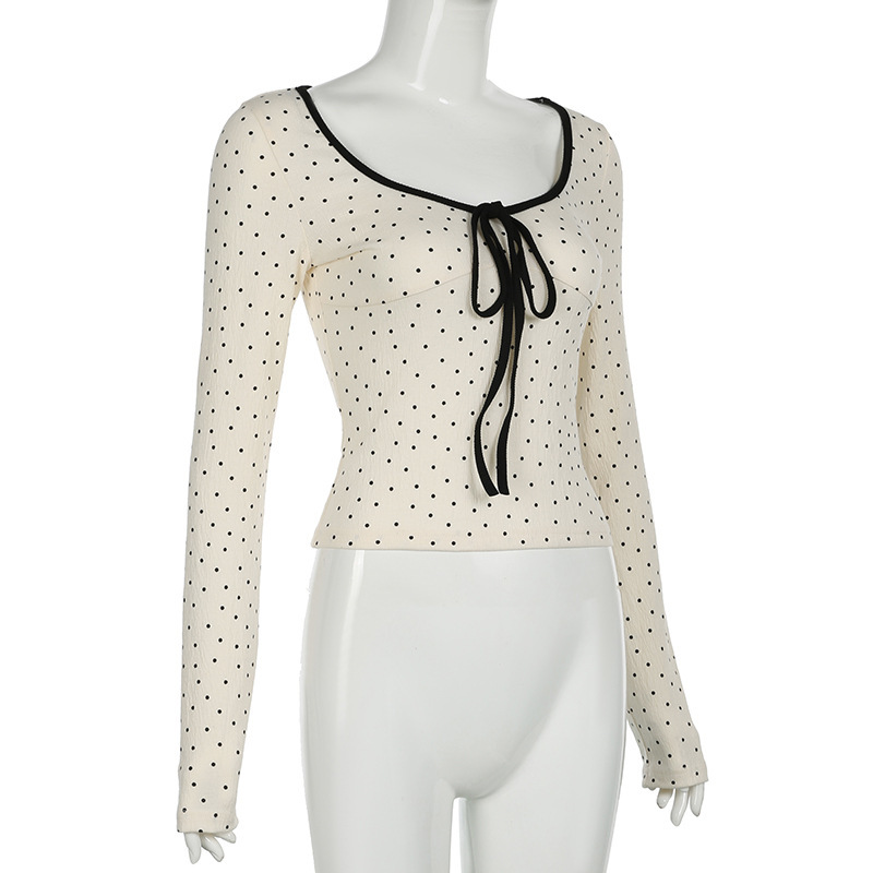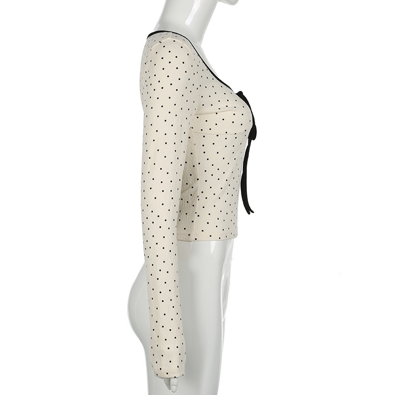骨格ウェーブ デコルテリボン×ドット柄 フレンチガーリートップス