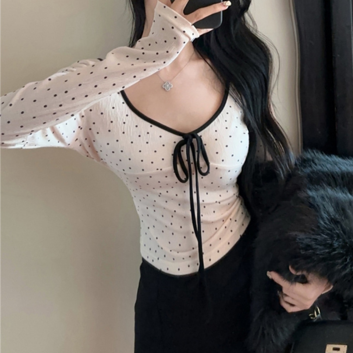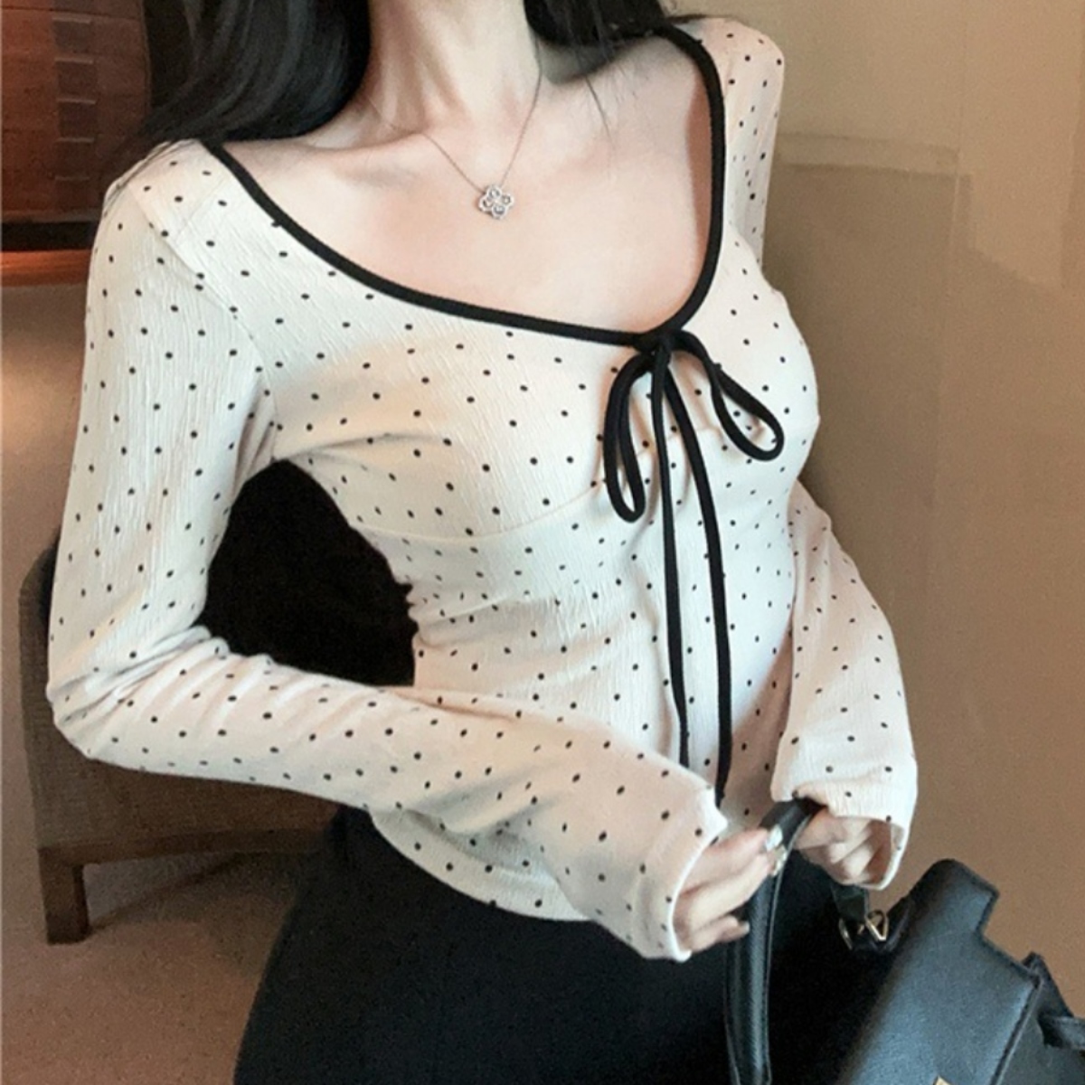 骨格ウェーブさんの「欲しい!」を詰め込んだ大本命トップス。 寂しく見えがちなデコルテは、華やかなリボンデザインで自然にボリュームアップ。視線を上に集めることで、スタイルアップも叶います。 柔らかな肌質に馴染むとろみ素材と、女性らしさを引き立てるドット柄を採用。開きすぎないUネックは鎖骨を美しく見せ、配色パイピングが全体を引き締めて小顔効果も◎。 袖口が広がるフレアスリーブで、手首まで華奢見え。ハイウエストボトムにインすれば、ウェーブさんの魅力であるくびれを最大限にアピールできます。デートや写真映えしたい日にぴったりの一枚です。