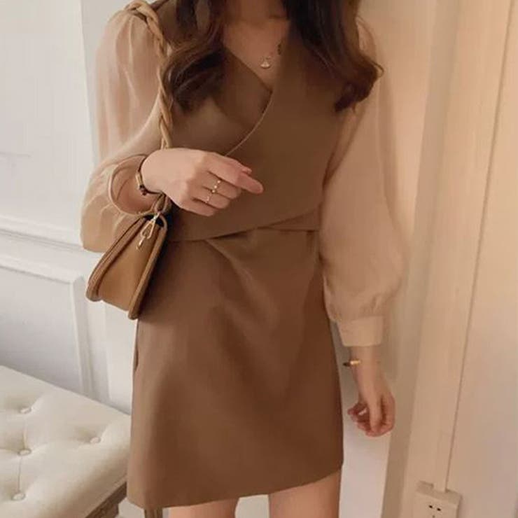 骨格ウェーブ 韓国風 カシュクール ミニワンピース Aライン 長袖 ウエストシェイプ