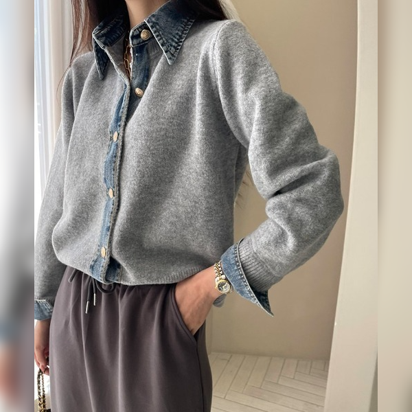 柔らかなニットにデニム素材を組み合わせた、遊び心のあるデザインのジャケット。襟・前立て・袖口に効かせたデニムが視線を上半身に集め、骨格ウェーブさんが得意な華奢さをより引き立てます。シンプルなシルエットながらも、立体感のあるアクセントで全体にメリハリをプラス。ほどよいゆとりで羽織りとしても一枚着としても楽しめ、カジュアルの中に大人っぽさを感じさせる一枚です。