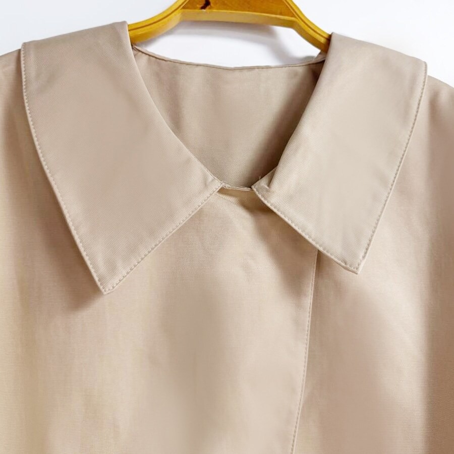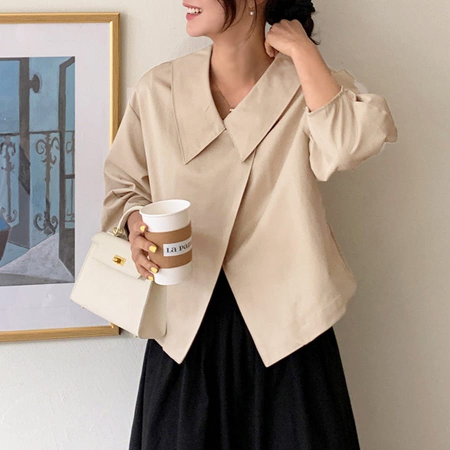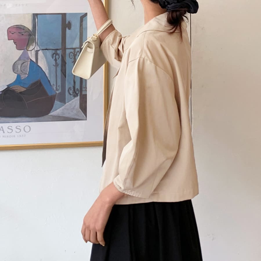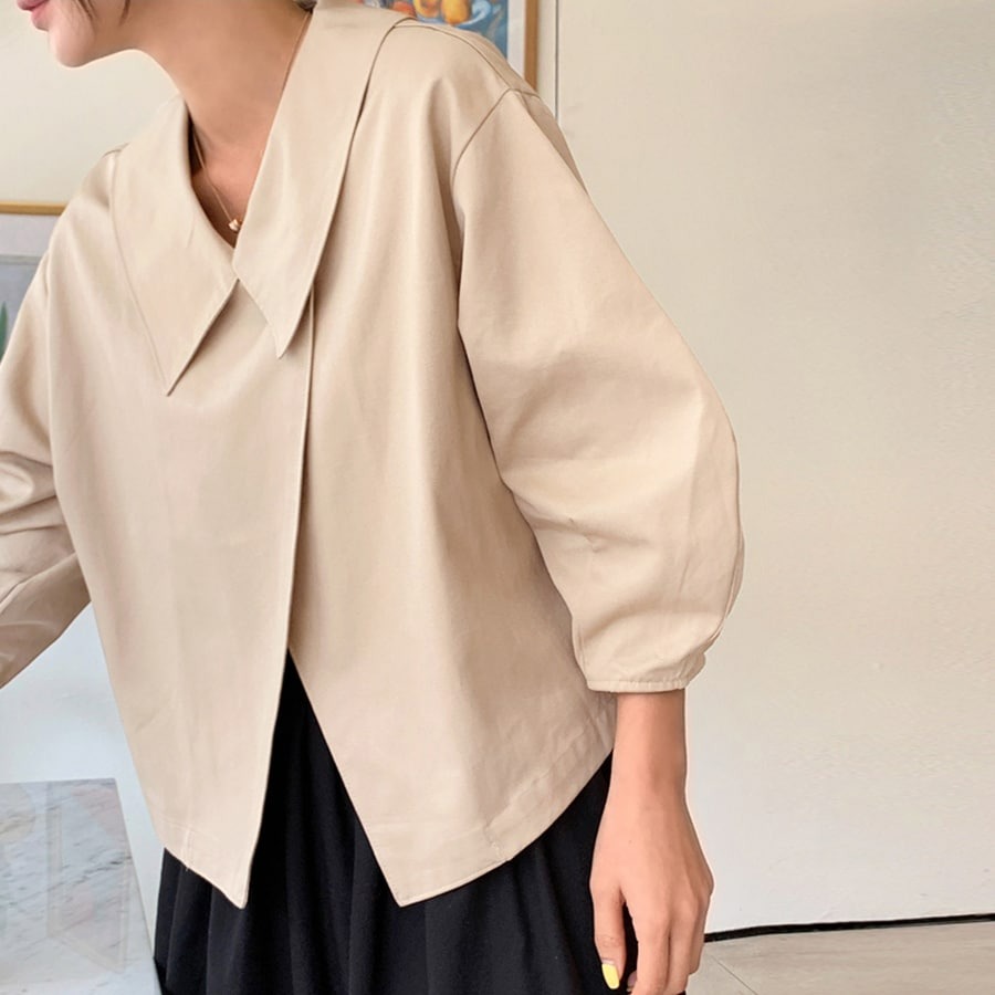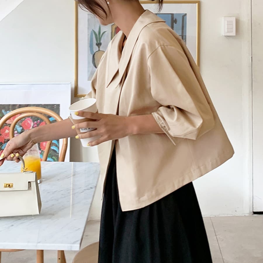 ブラウスのような軽やかさと、ジャケットの凛とした表情を併せ持ち、オフィスでも週末のカフェでも自然に馴染みます。