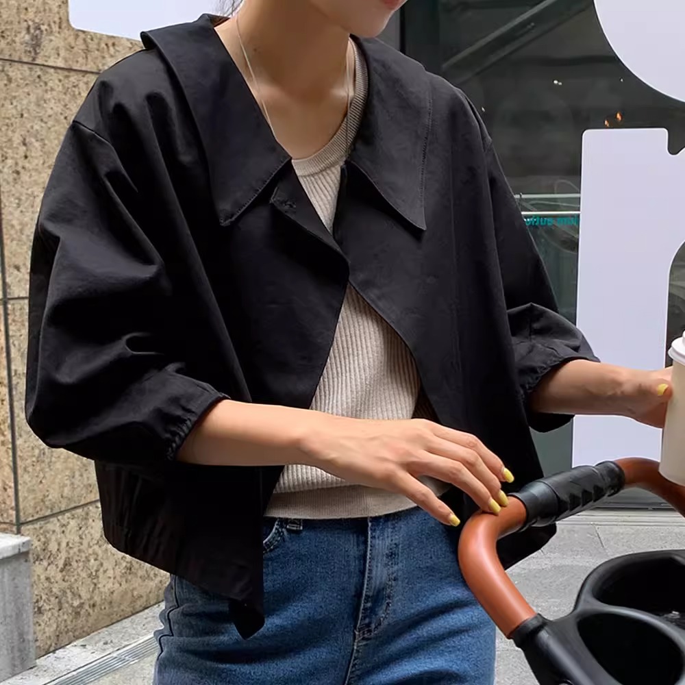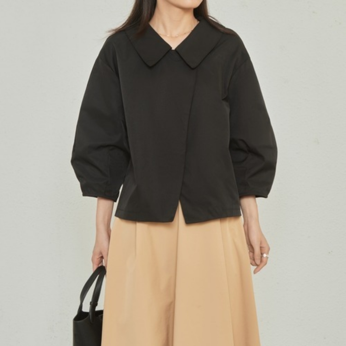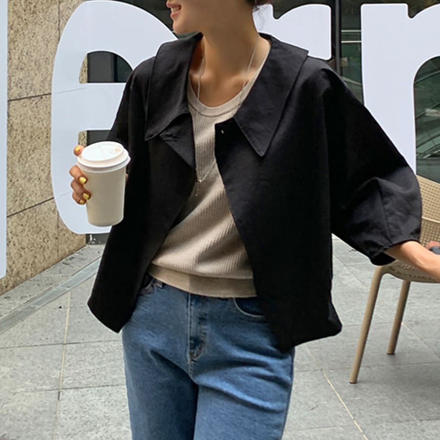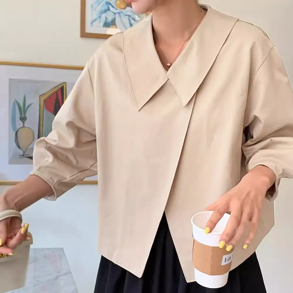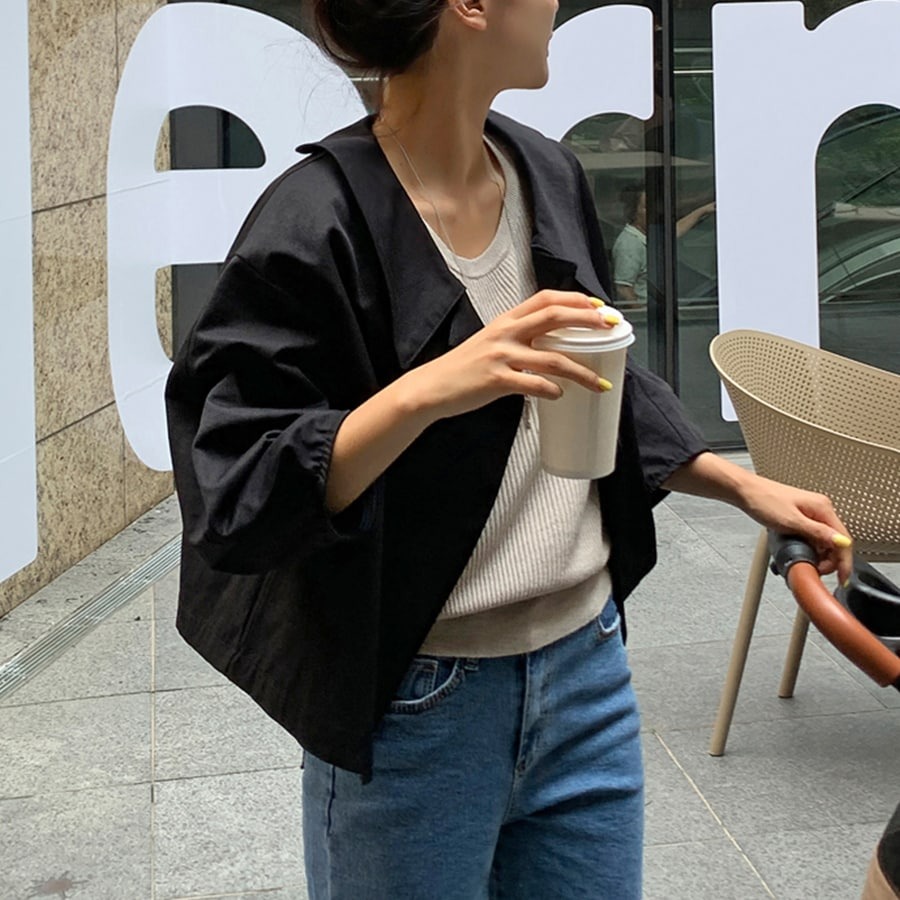 ブラウスのような軽やかさと、ジャケットの凛とした表情を併せ持ち、オフィスでも週末のカフェでも自然に馴染みます。