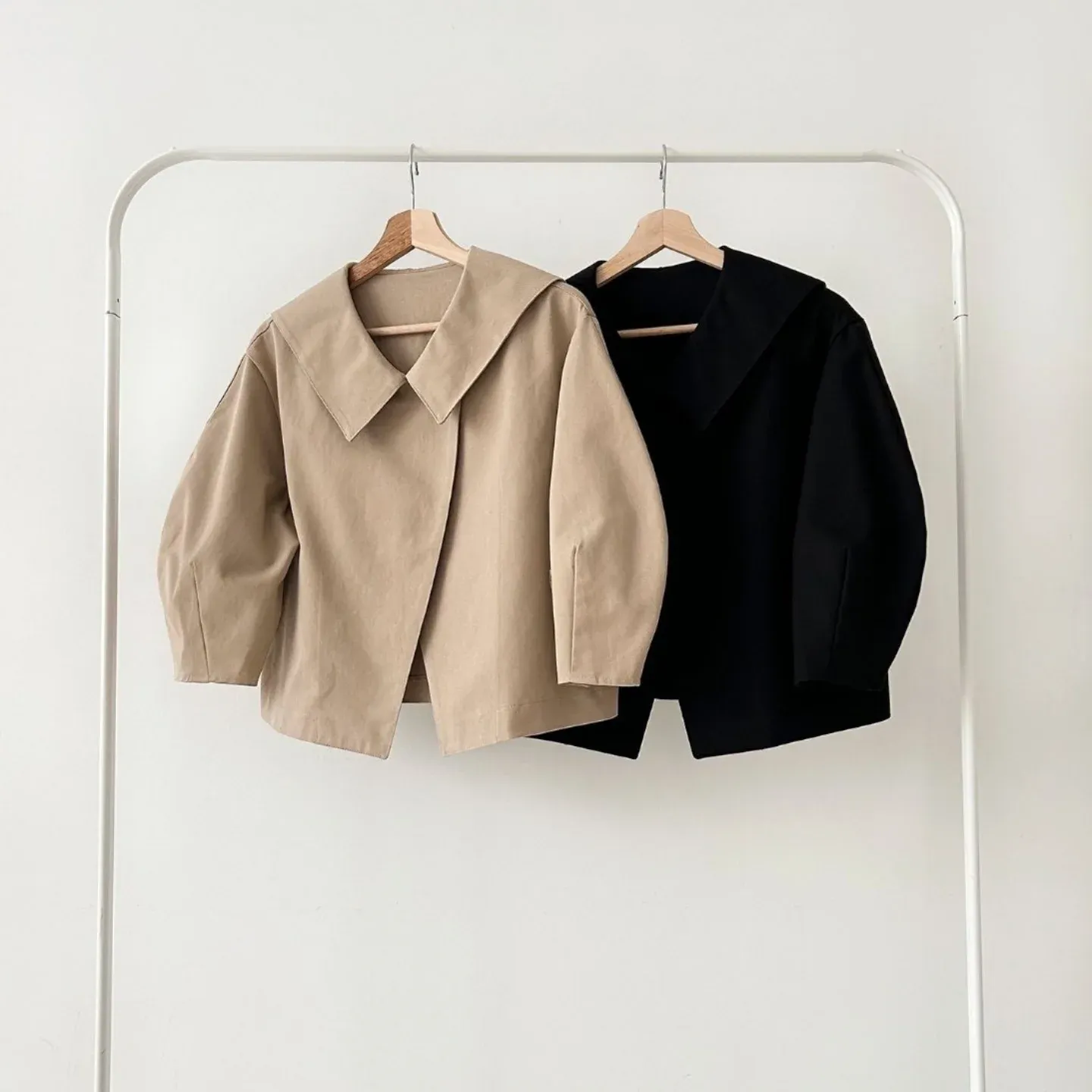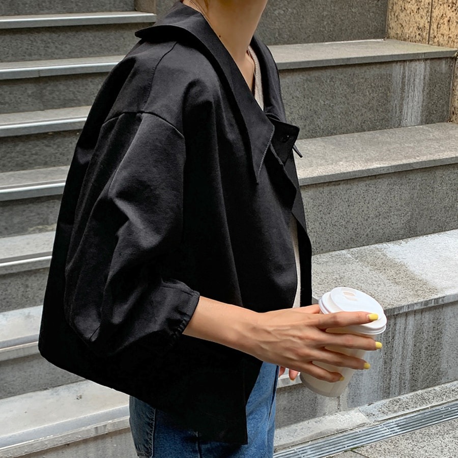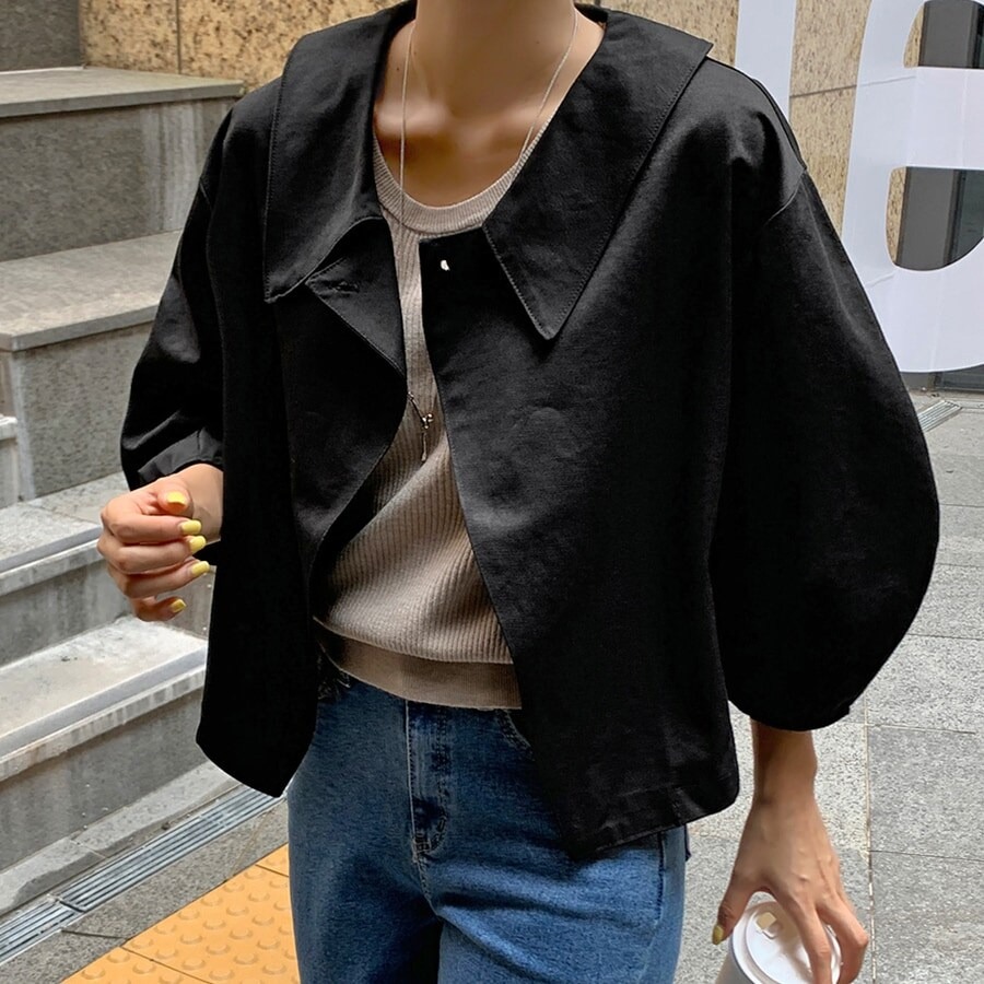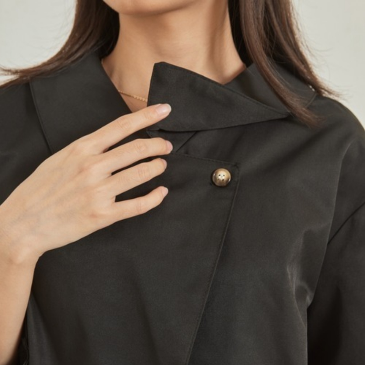 ブラウスのような軽やかさと、ジャケットの凛とした表情を併せ持ち、オフィスでも週末のカフェでも自然に馴染みます。