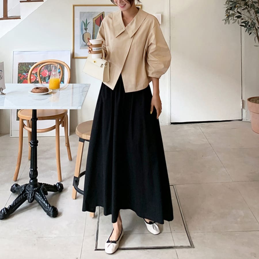 視線を上に引き上げる大きめのビッグカラーが顔まわりを華やかに見せ、自然なスタイルアップを実現します。