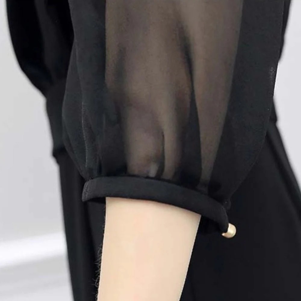華奢な上半身を美しく見せるVネックと、やわらかなシアー袖が女性らしい抜け感を演出します。