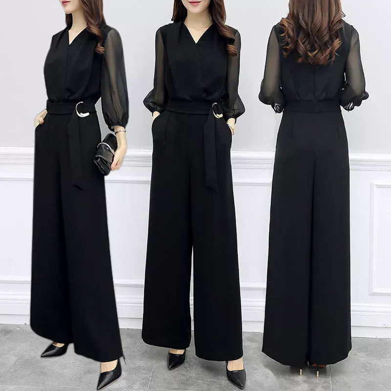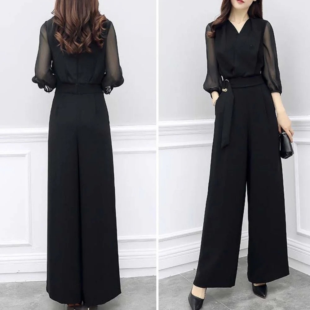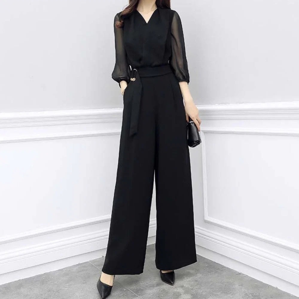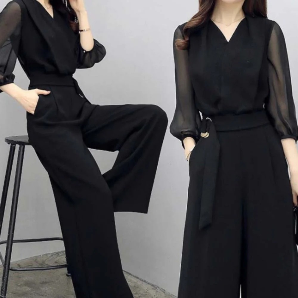 骨格ウェーブ シアー袖×Vネック ハイウエストオールインワン