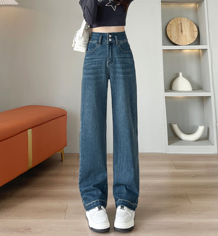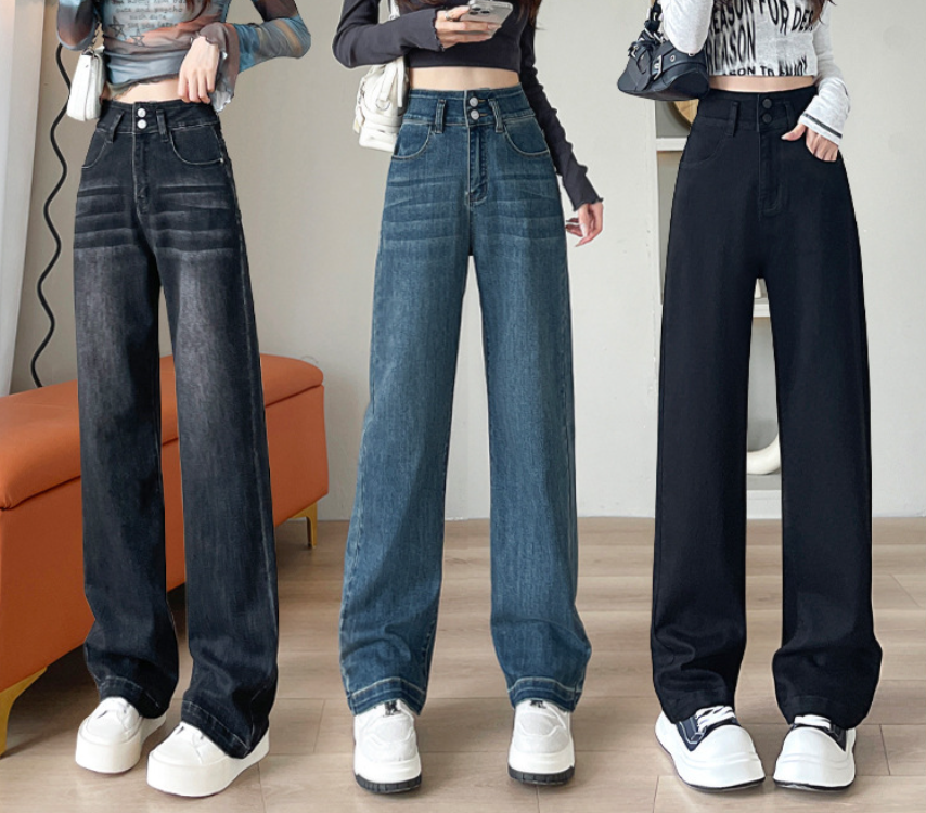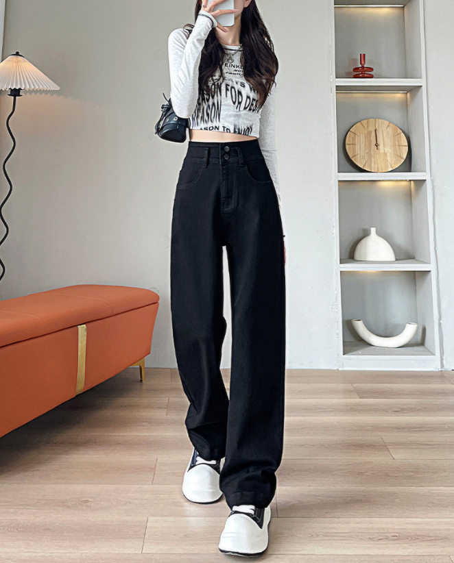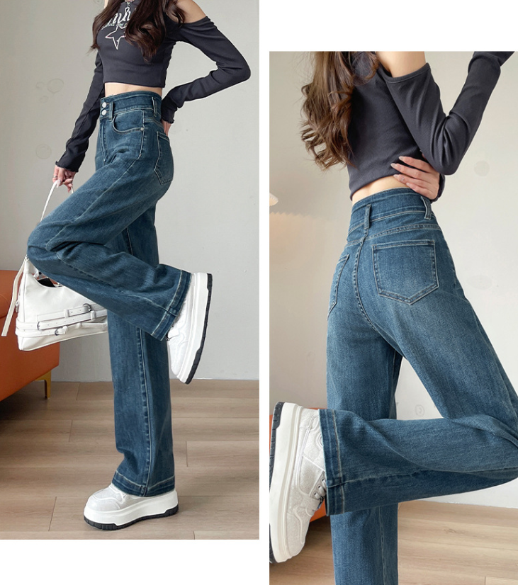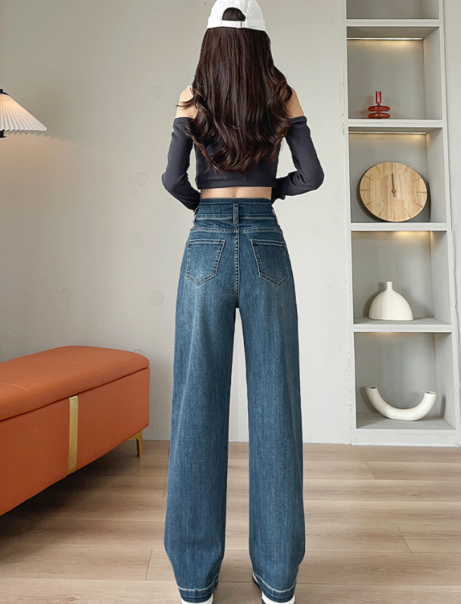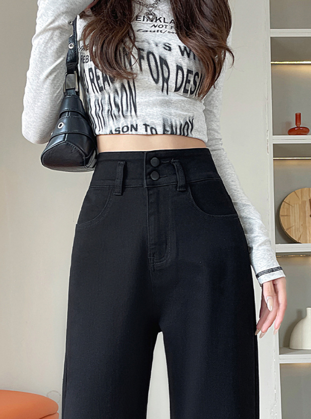 このデニムは、ハイウエストと印象的な2連ボタンが視線を上に集め、自然なくびれを演出。