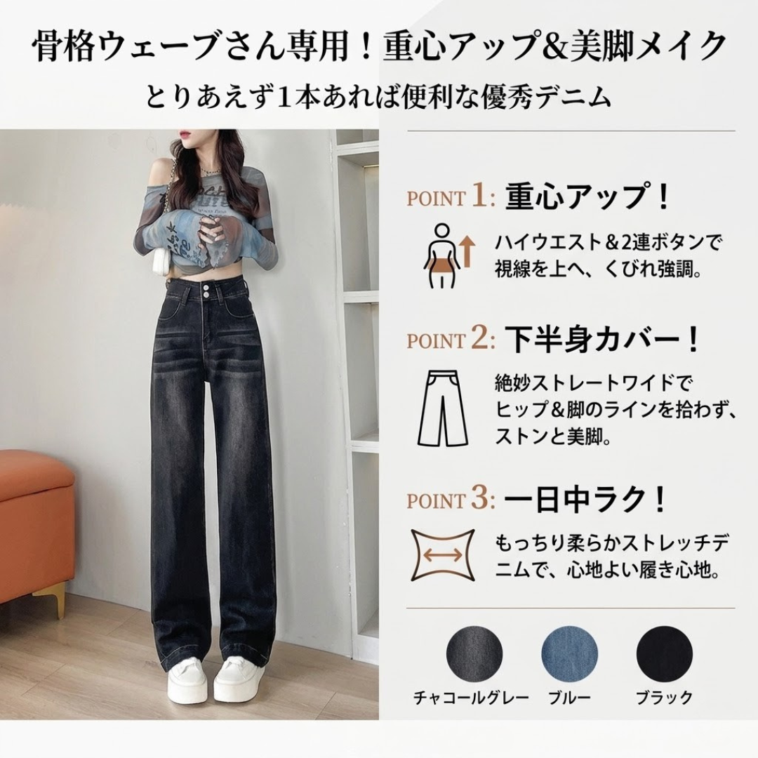 カラーはチャコールグレー、ブルー、ブラックの3色展開。着るだけでスタイルアップが叶う優秀デニムです。