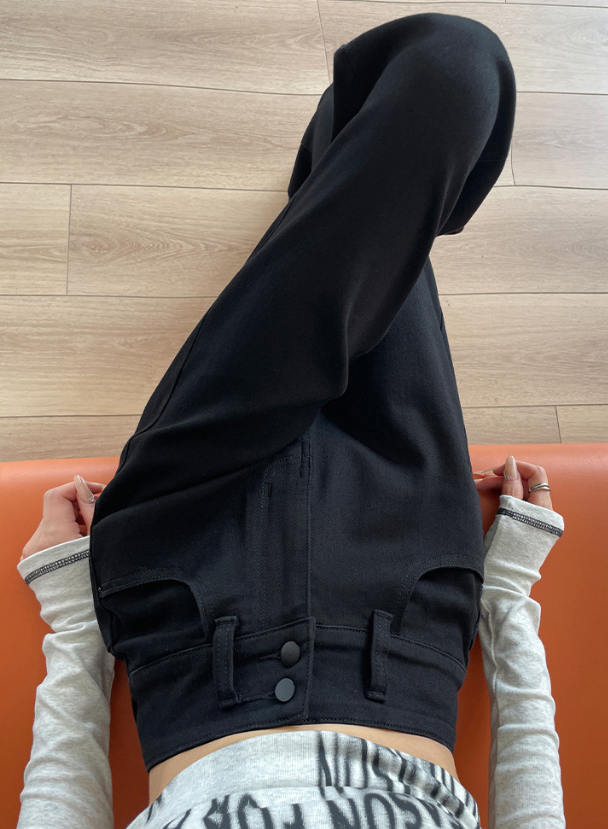 ハイウエスト設計で腰回りをすっきり見せ、印象的な2連ボタンが視線を上に引き上げて、自然なくびれを演出します。