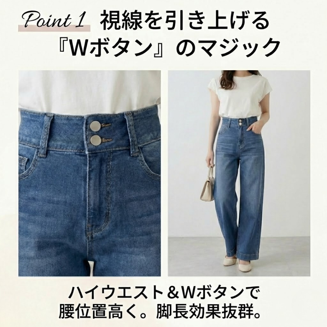 骨格ウェーブさんのために設計された、美脚見えを叶えるWボタンストレートデニム。
