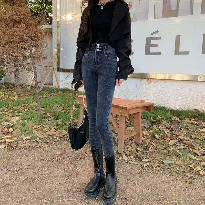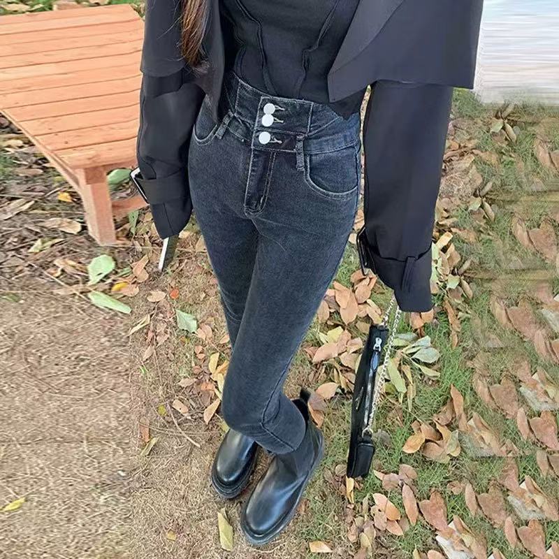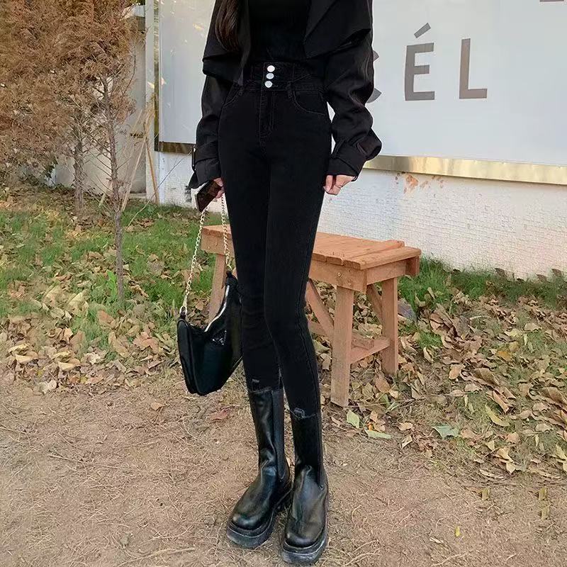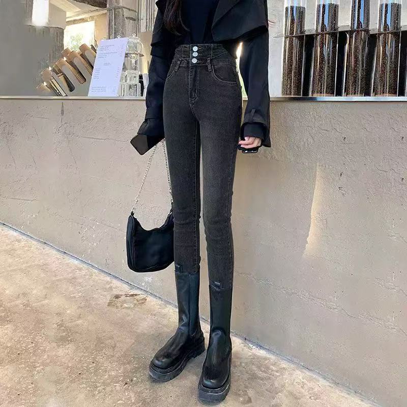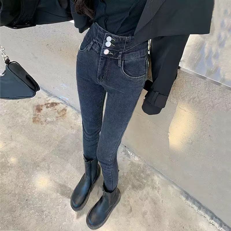 骨格ウェーブボタンハイウエストタイトフィットスキニーパンツ