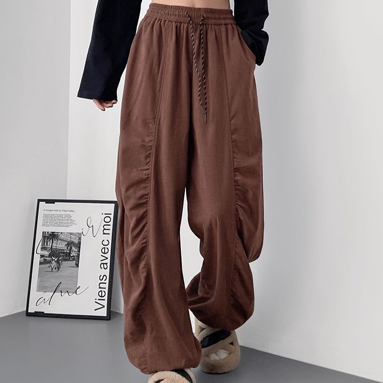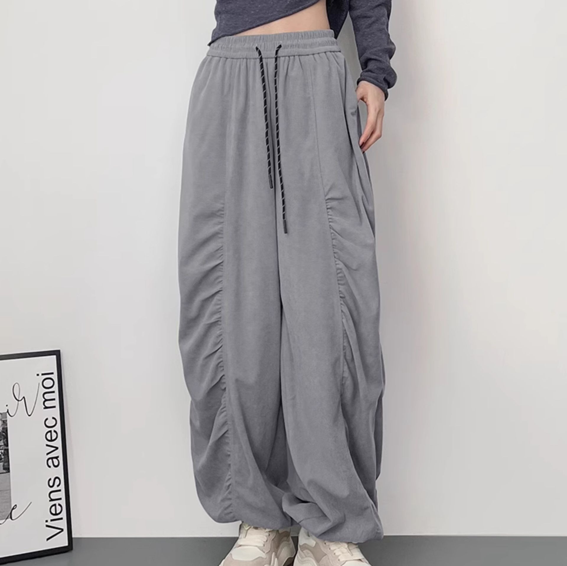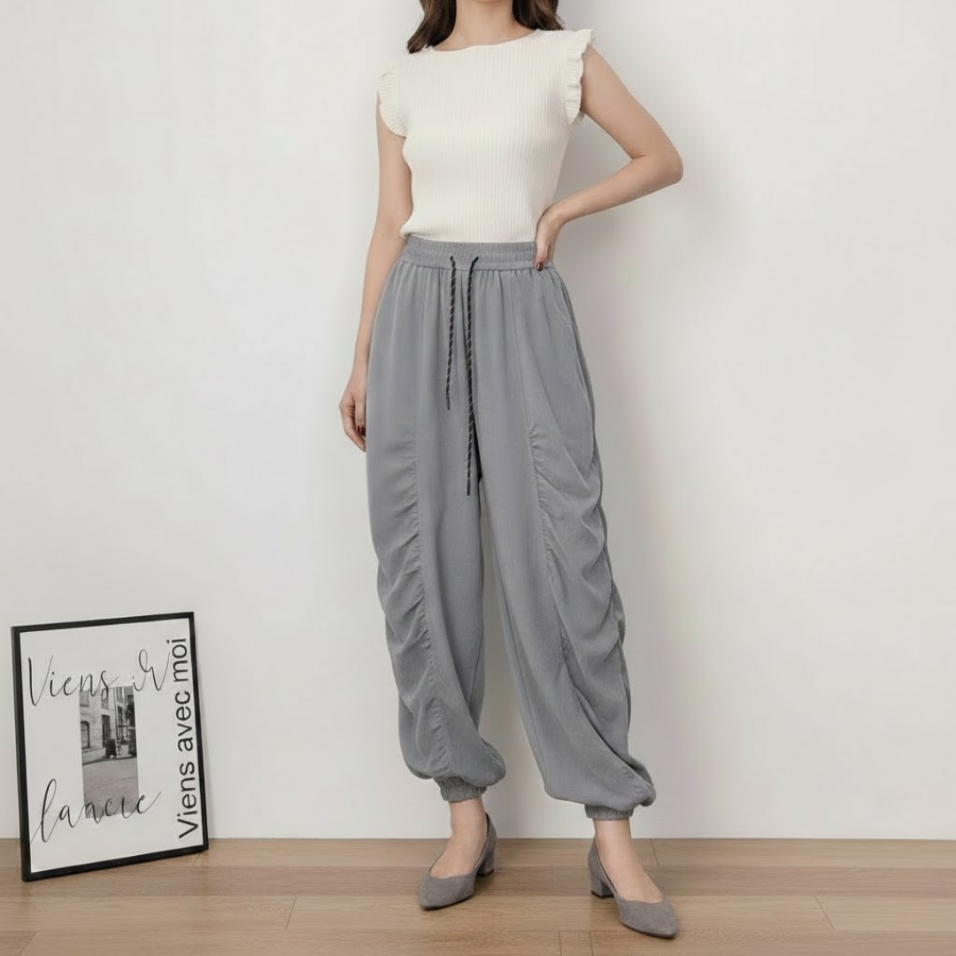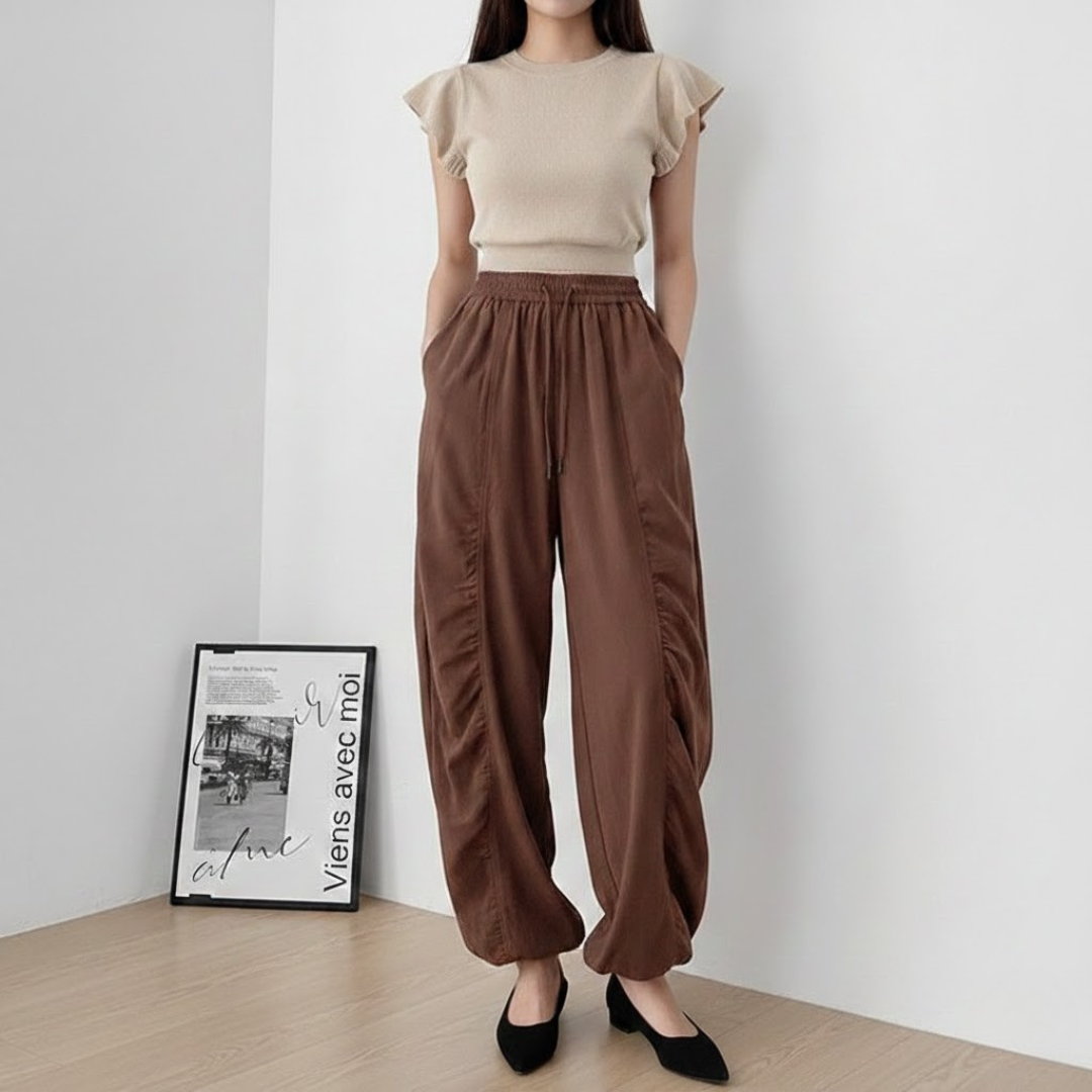 このパンツの主役は、サイドにたっぷりと施された「ふんわりギャザー」。