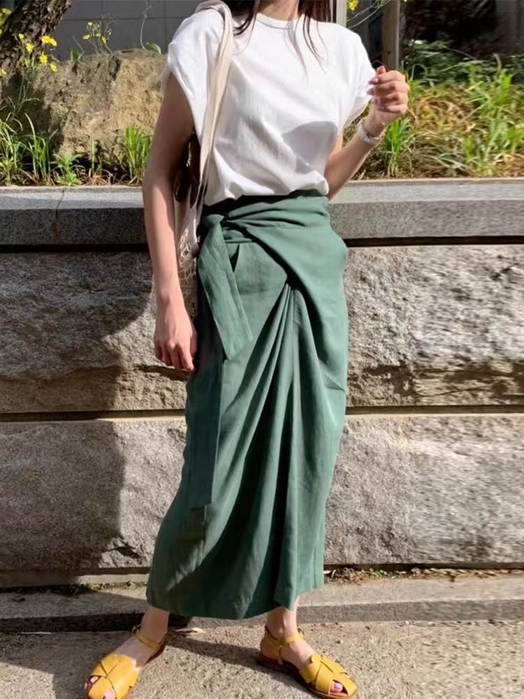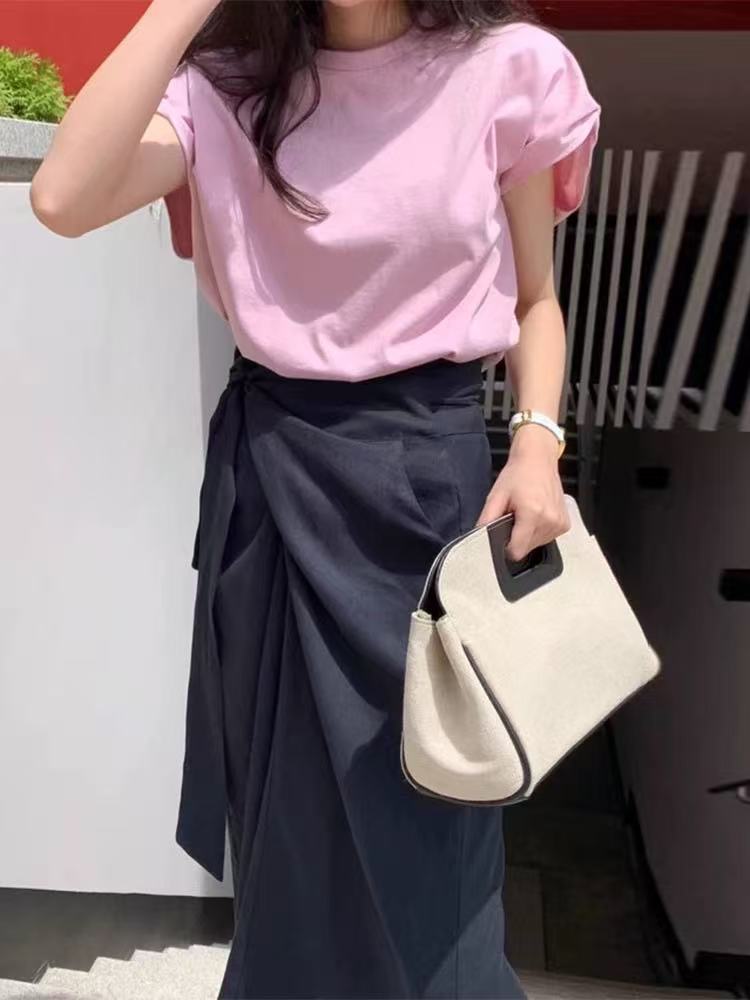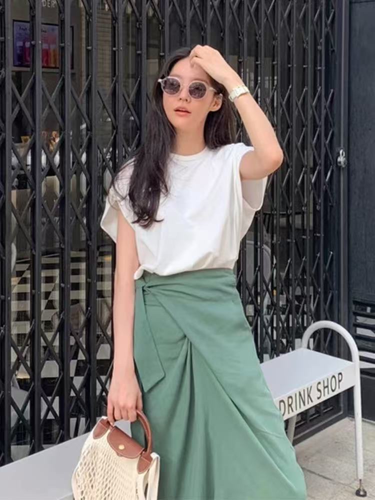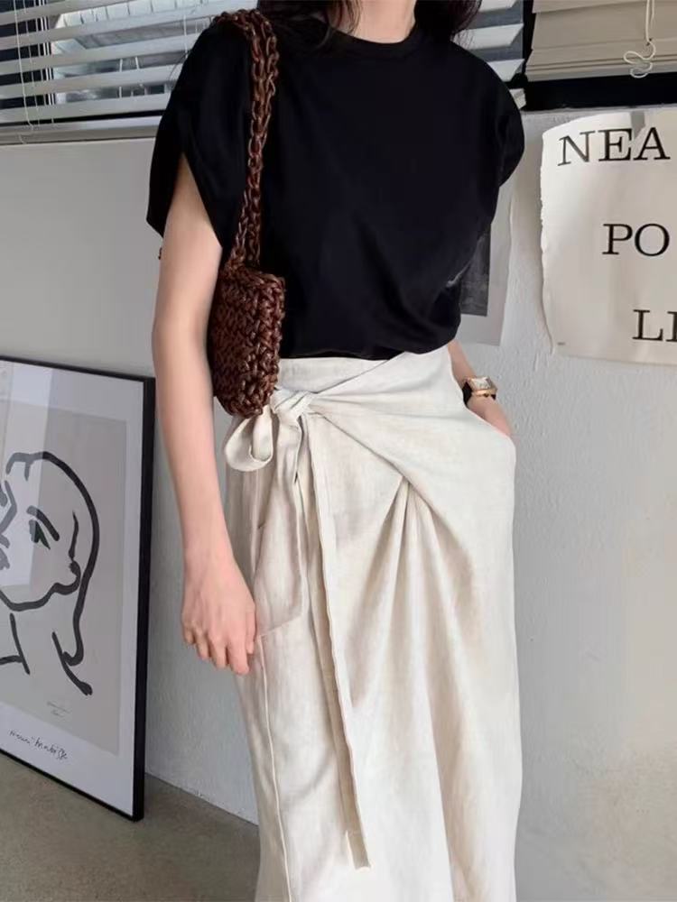 シャツ&ハイウエストスカートのセットアップです。ラウンドネックの半袖Tシャツはシンプルで着回しやすく、ハイウエストスカートは不規則なストラップデザインで個性をプラスします。韓国風のシックで甘い雰囲気を演出し、特別なコーディネートを楽しめるアイテムです。柔らかく肌触りの良い素材を使用し、デイリーから特別な日まで幅広く活躍します。