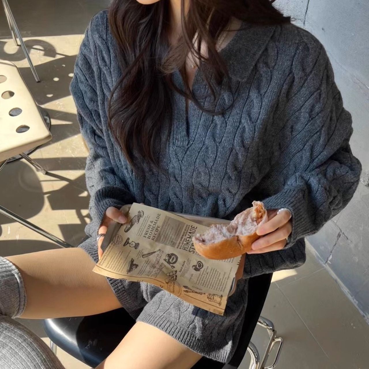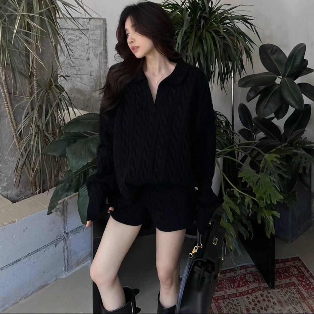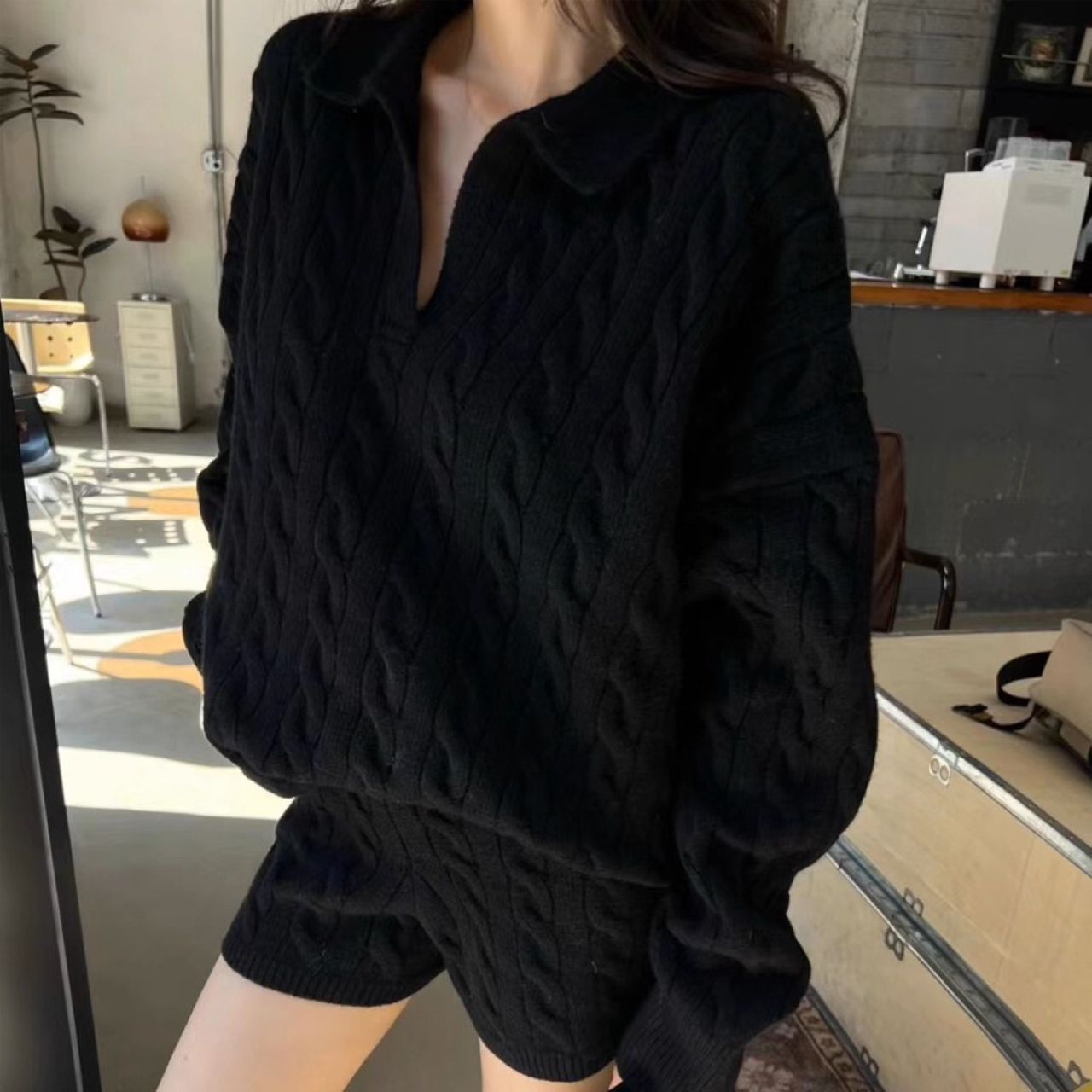 骨格ウェーブ ゆったりケーブル編み ニットトップス&ショートパンツ 2点セット