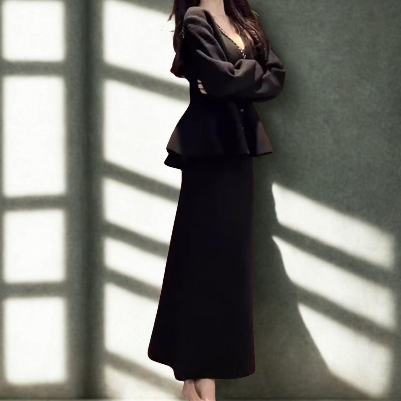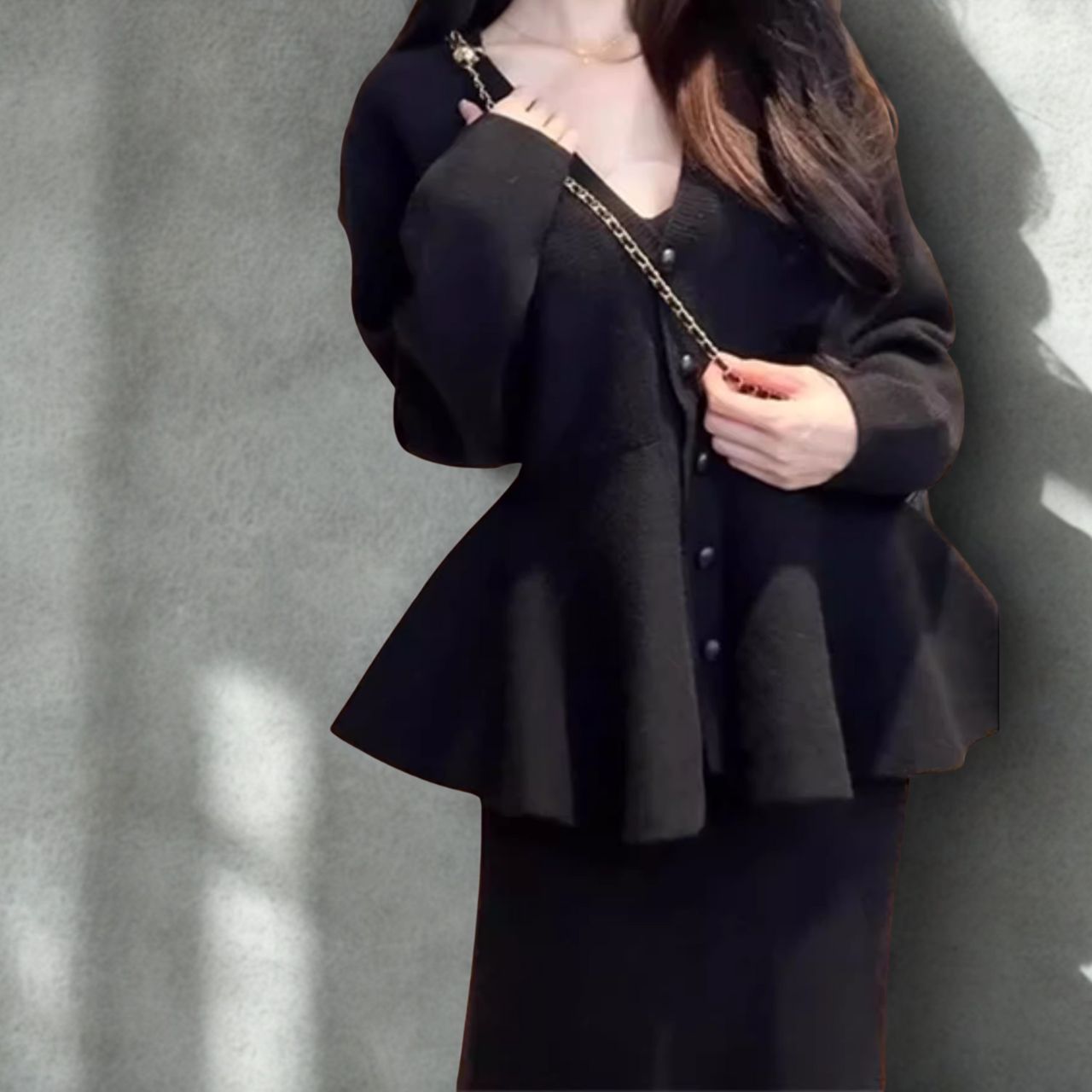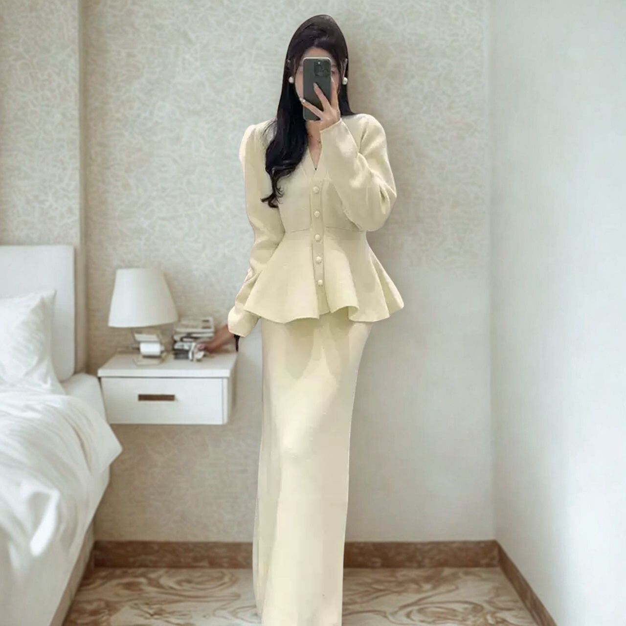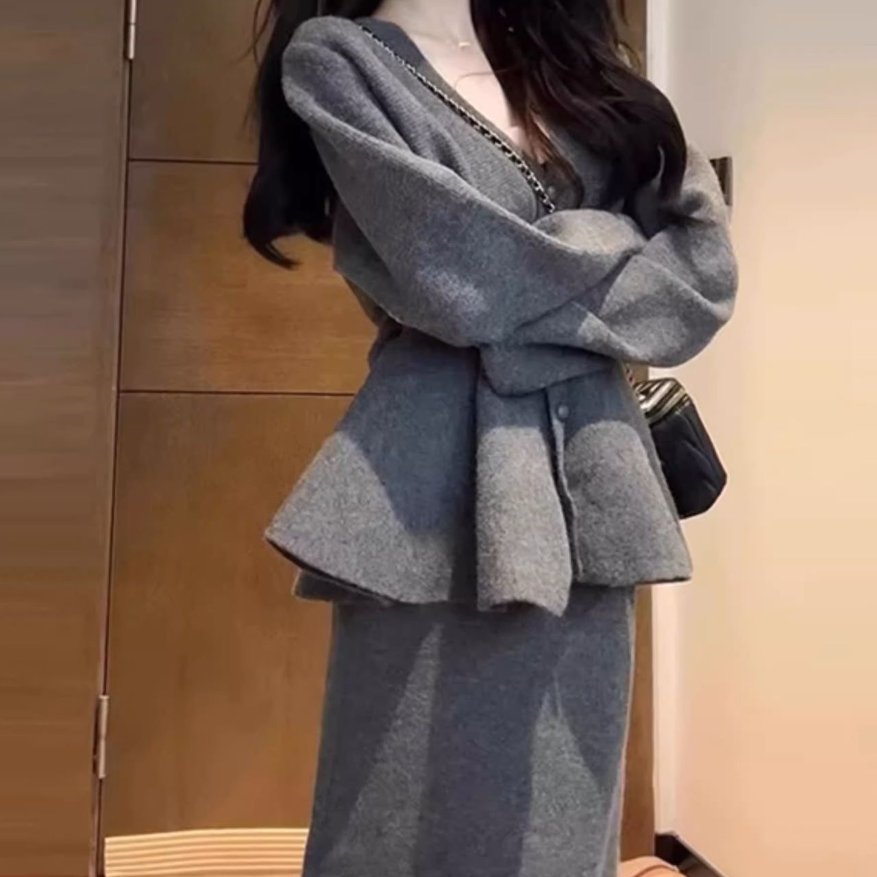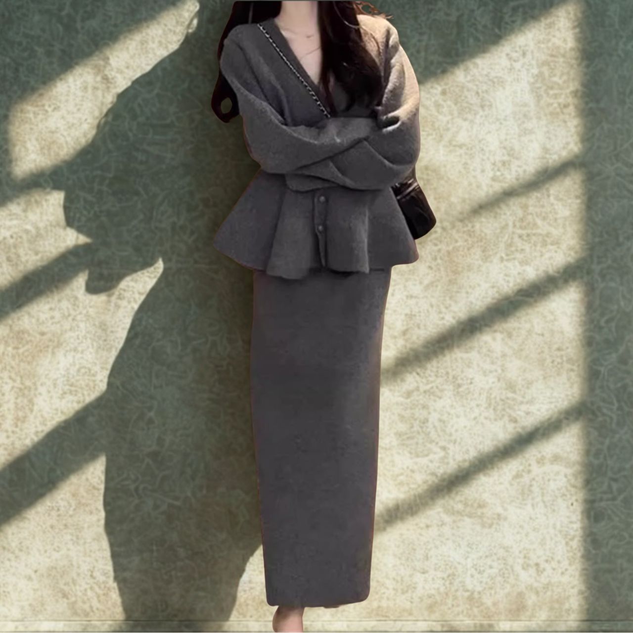 骨格ウェーブ 韓国風 Vネックニットカーディガン+スカート セットアップ ペプラムデザイン