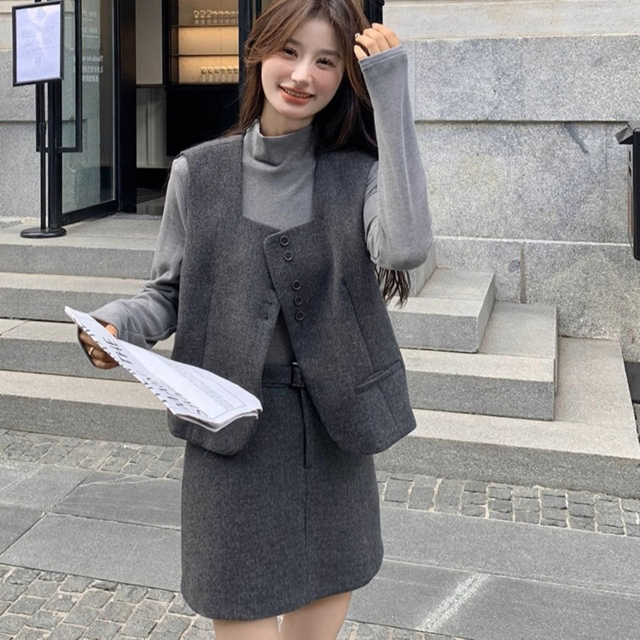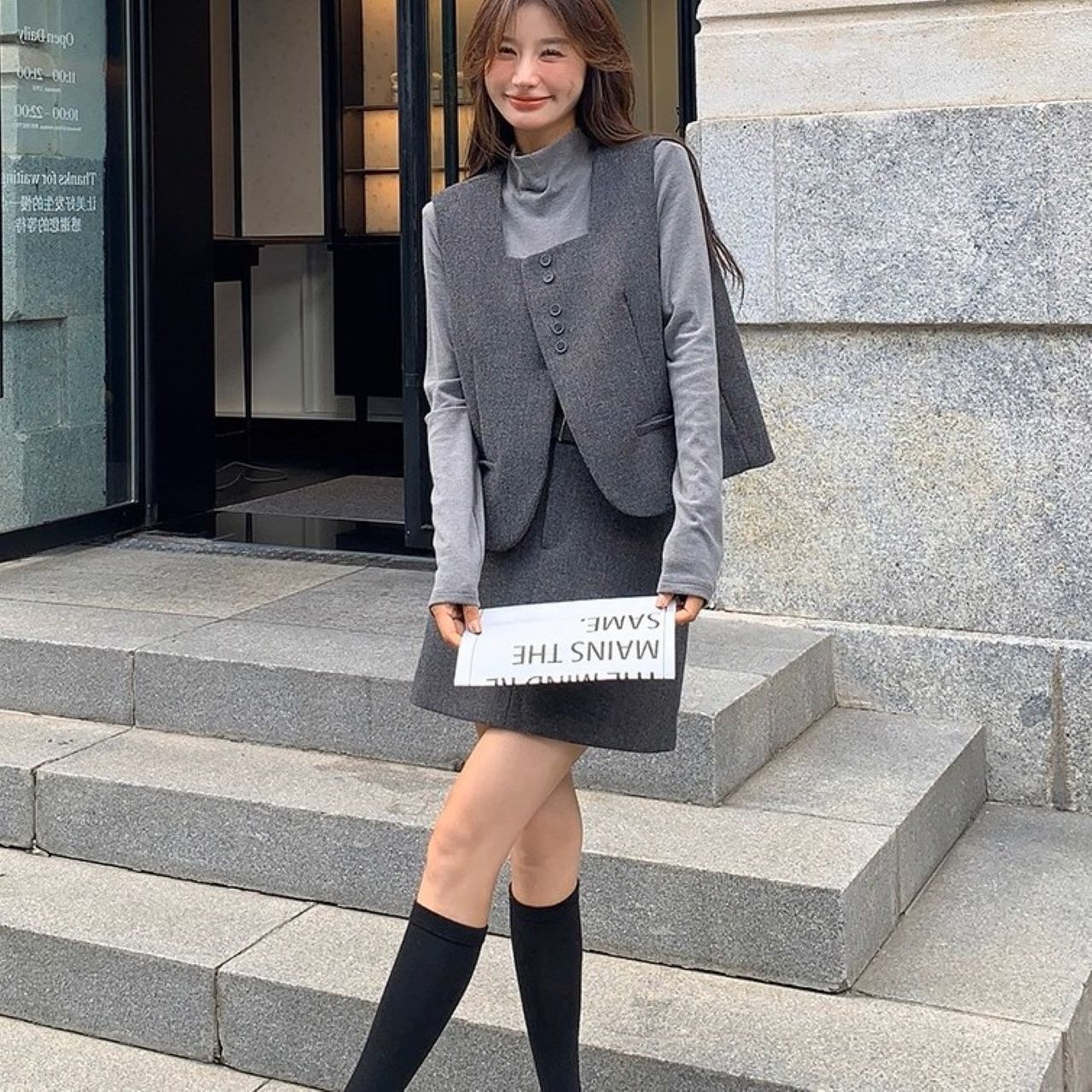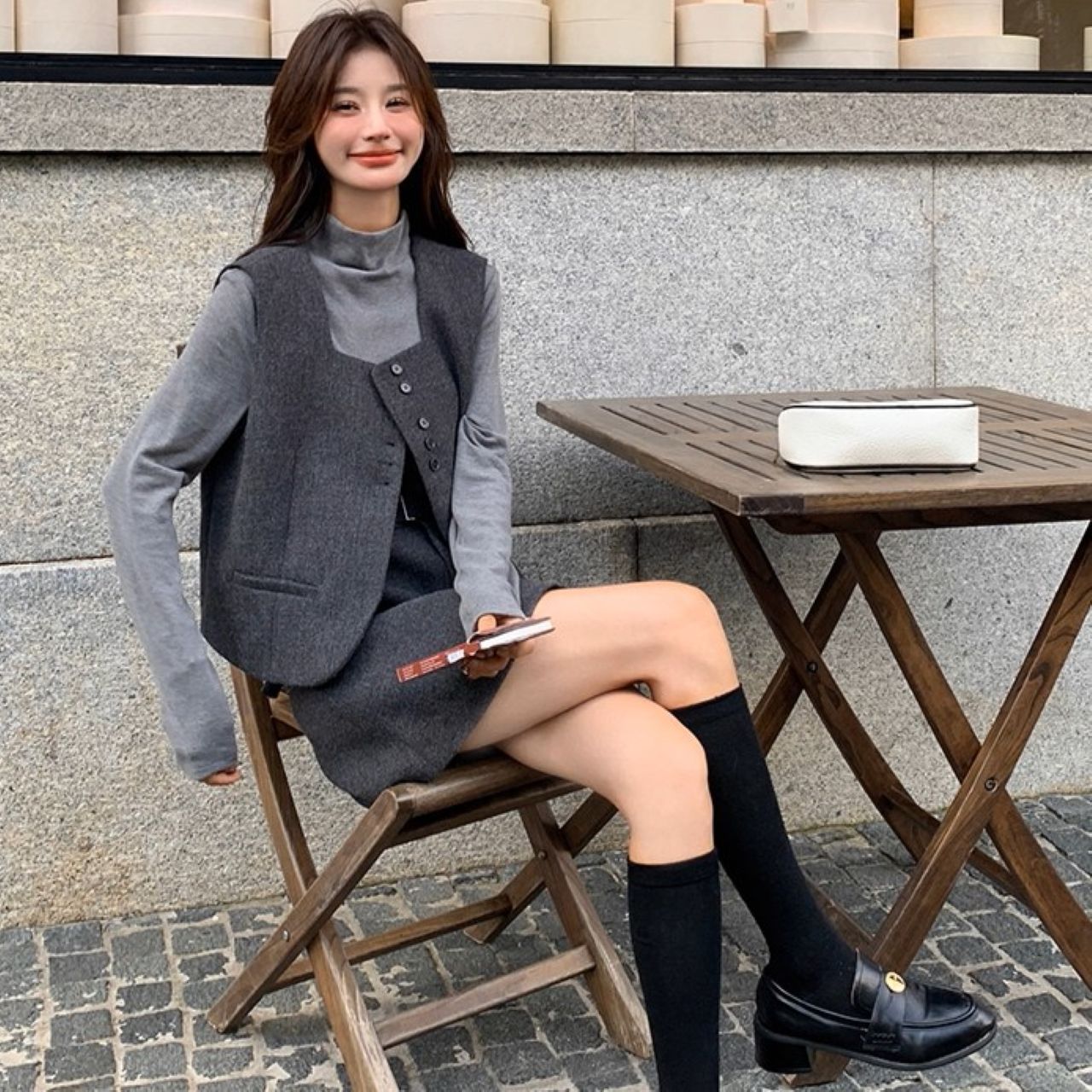骨格ウェーブ グレー ベスト+トップス+ミニスカート 3点セットアップ 韓国風 お出かけコーデ