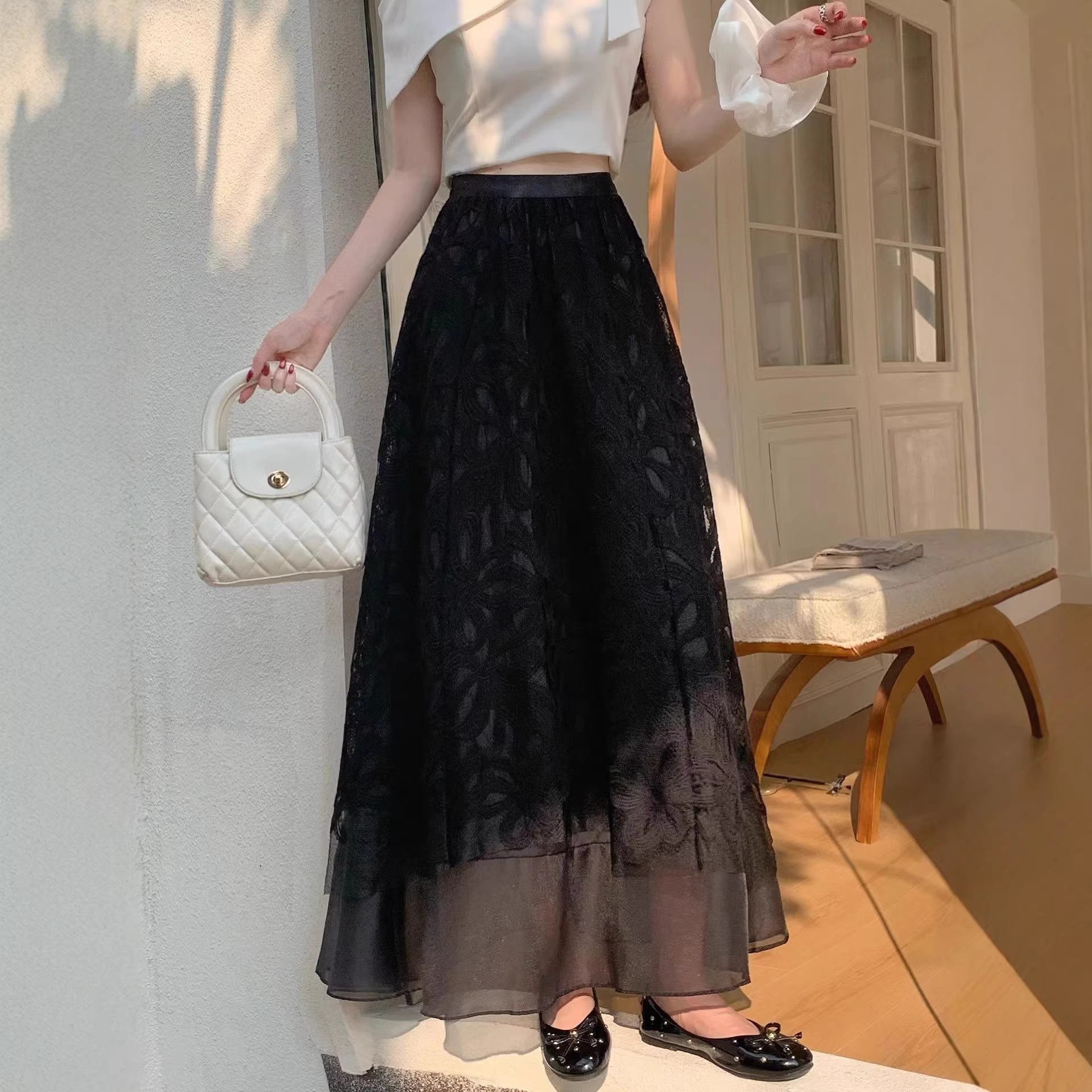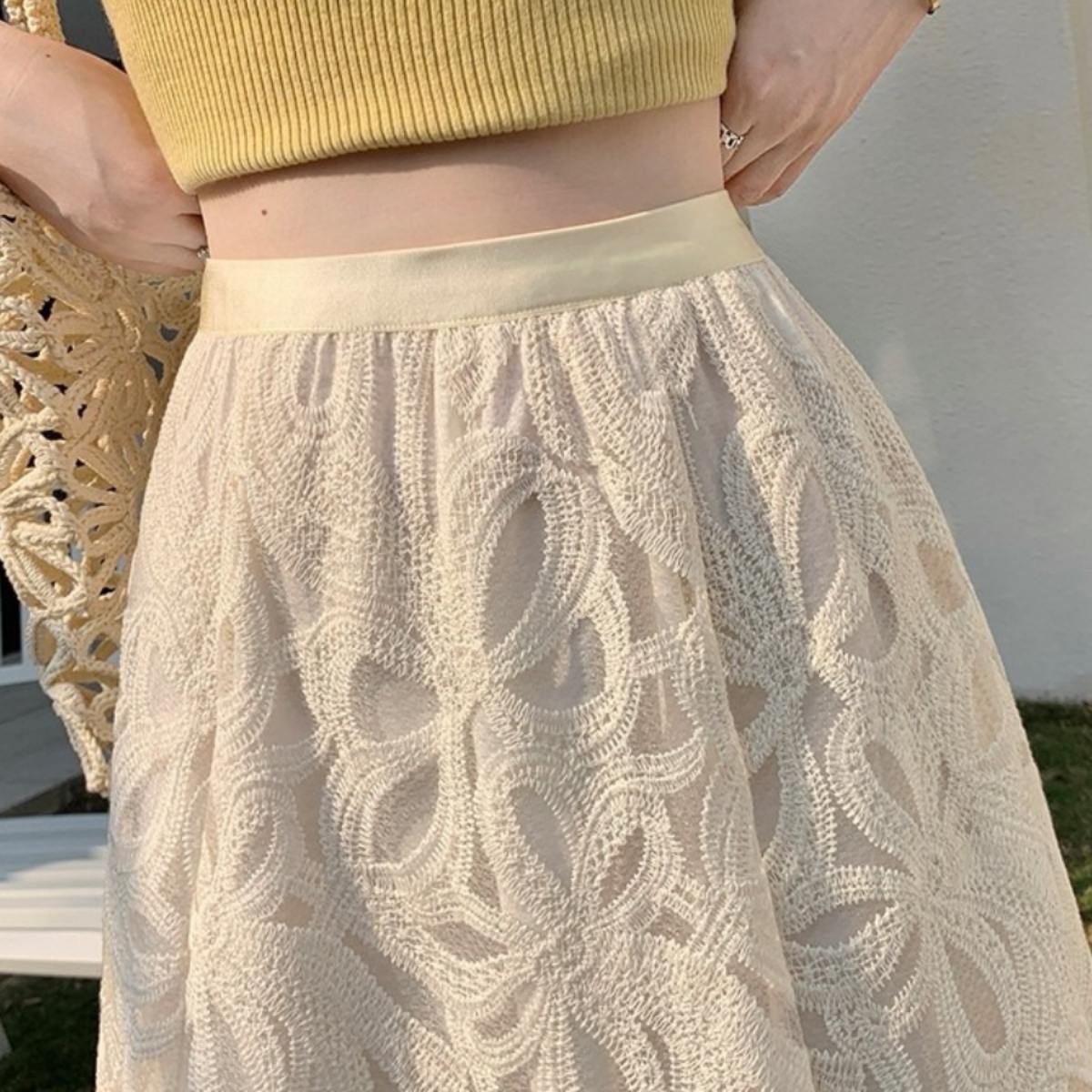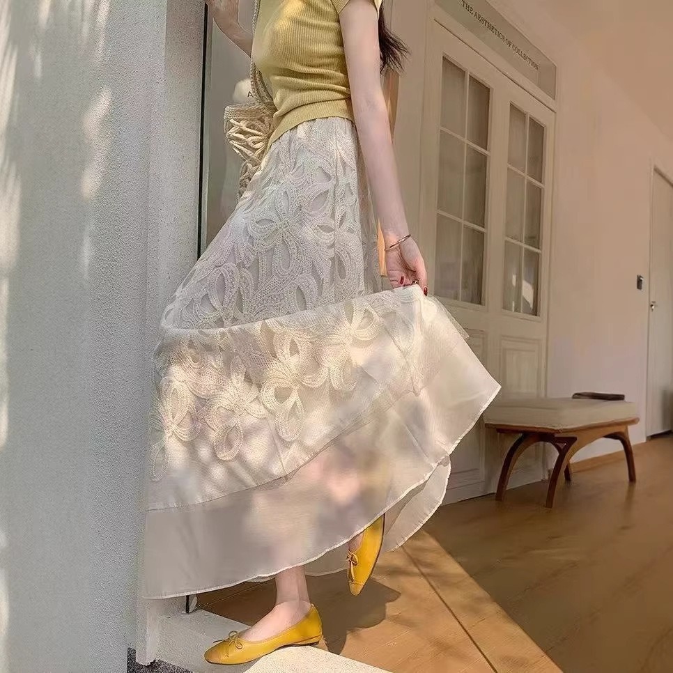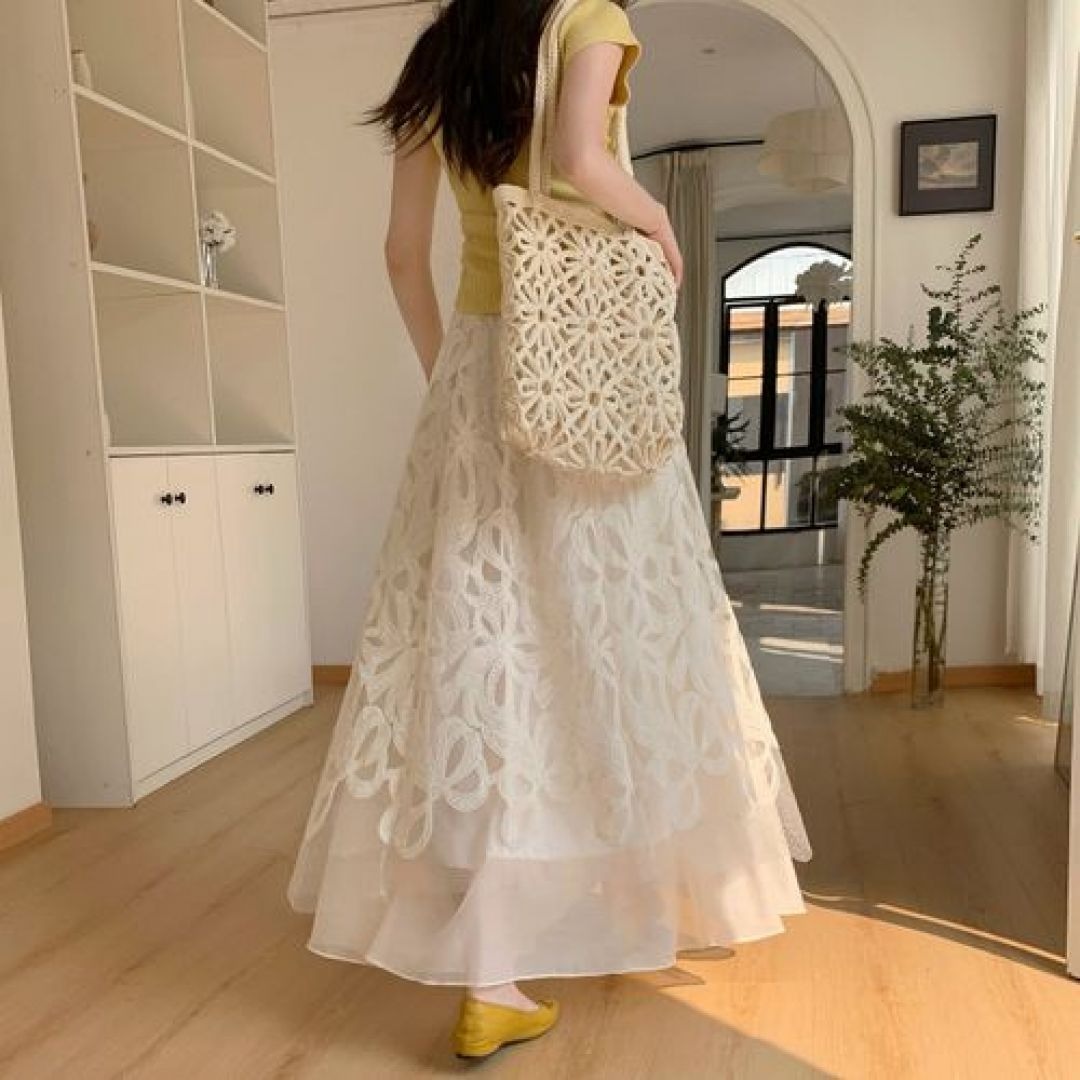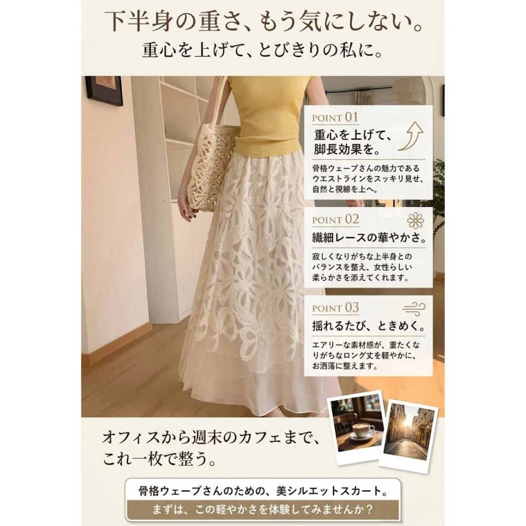軽やかな透け感と繊細なレースが魅力の、骨格ウェーブさんのための美シルエットスカート。