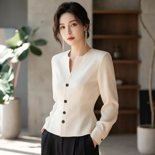 顔まわりはすっきりとしたVネックに。やわらかなアイボリーにブラックボタンをあしらい、甘さを抑えた上品な印象に仕上げました。とろみのある素材が心地よく、女性らしさを引き立てます。