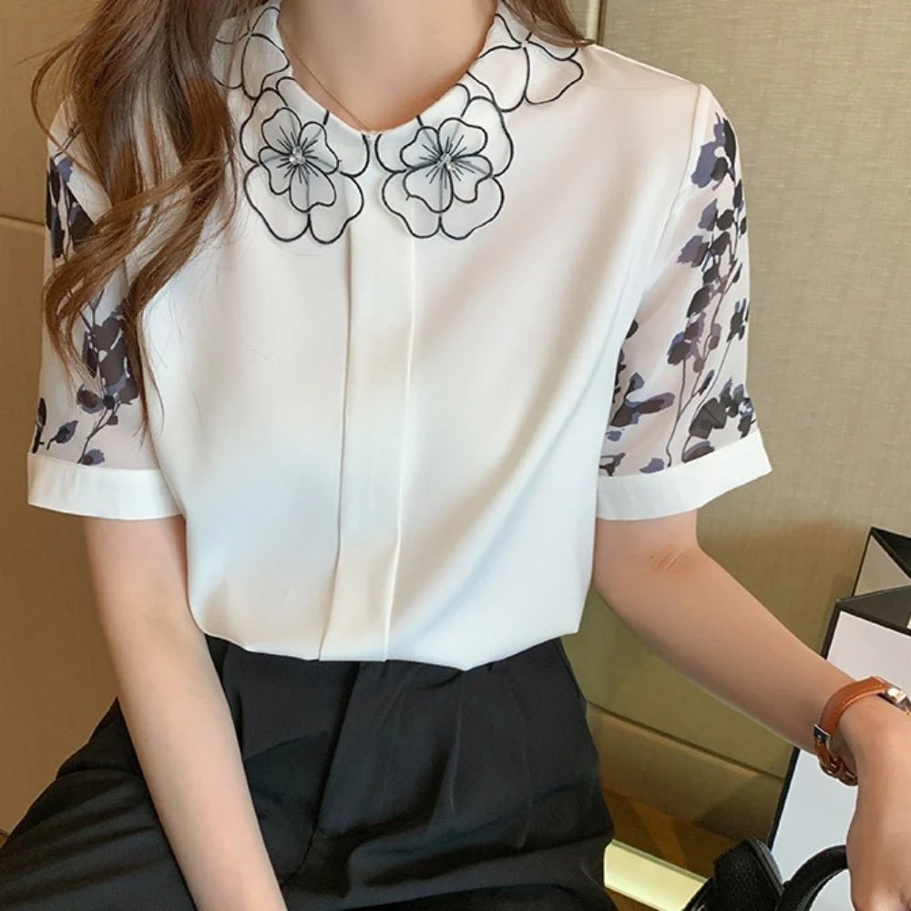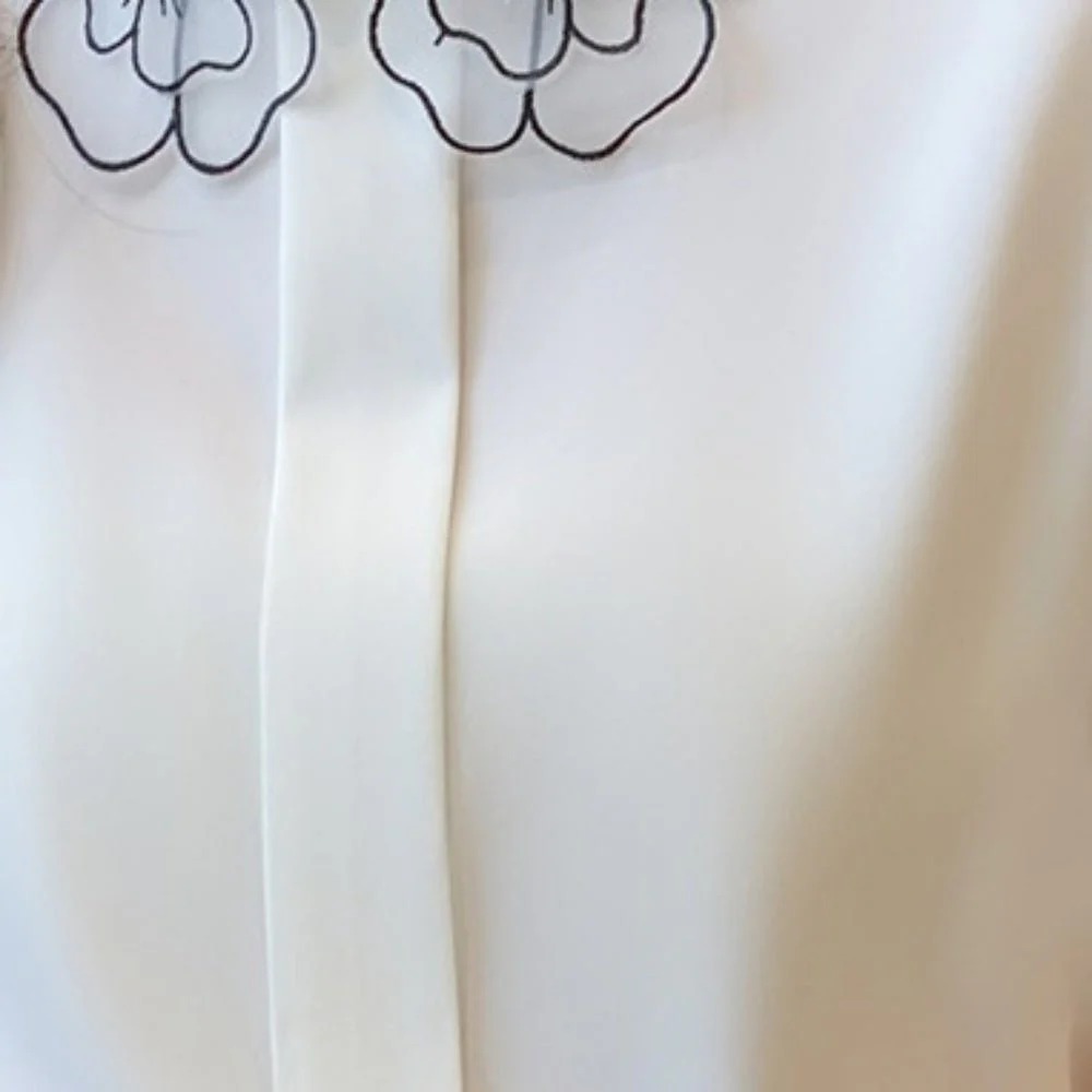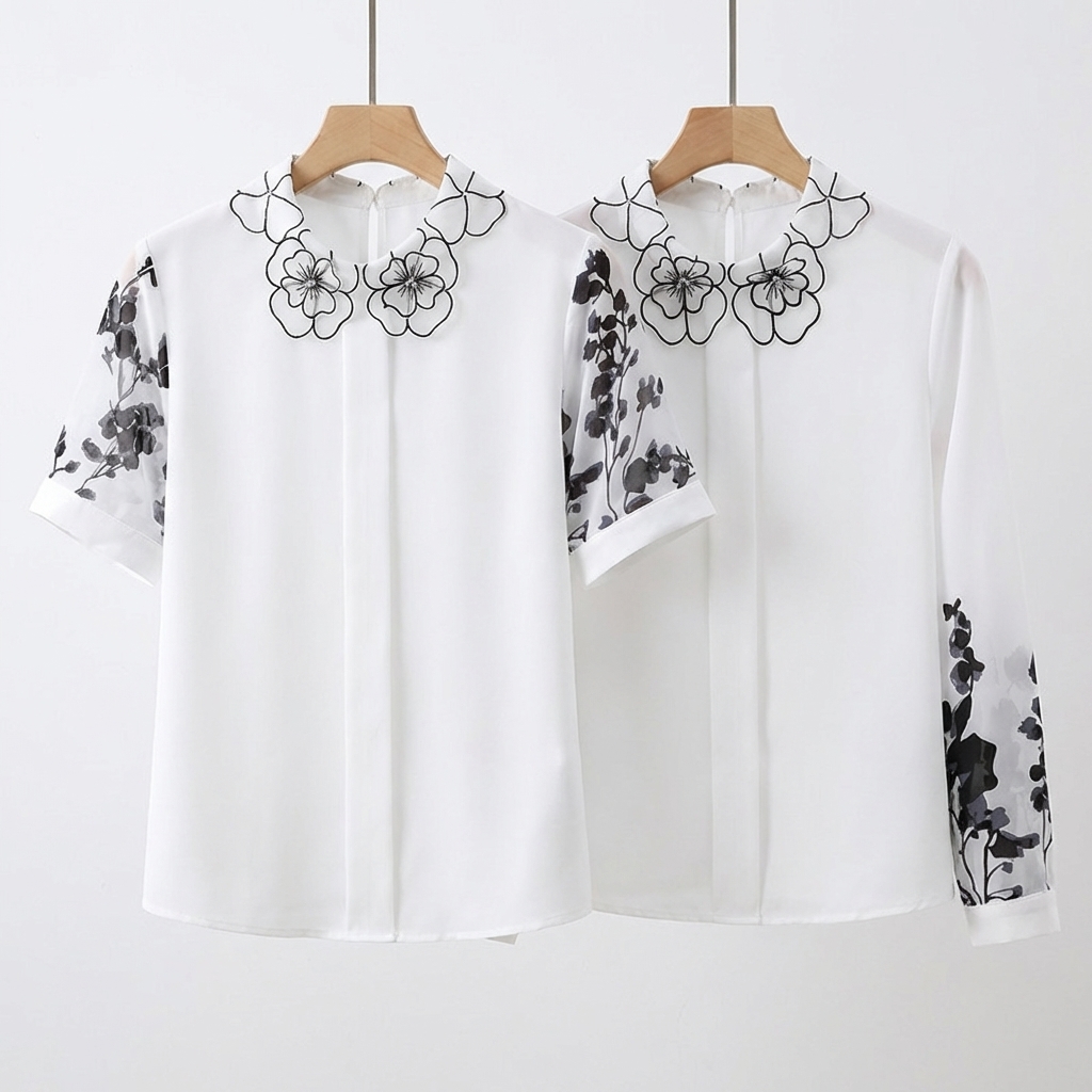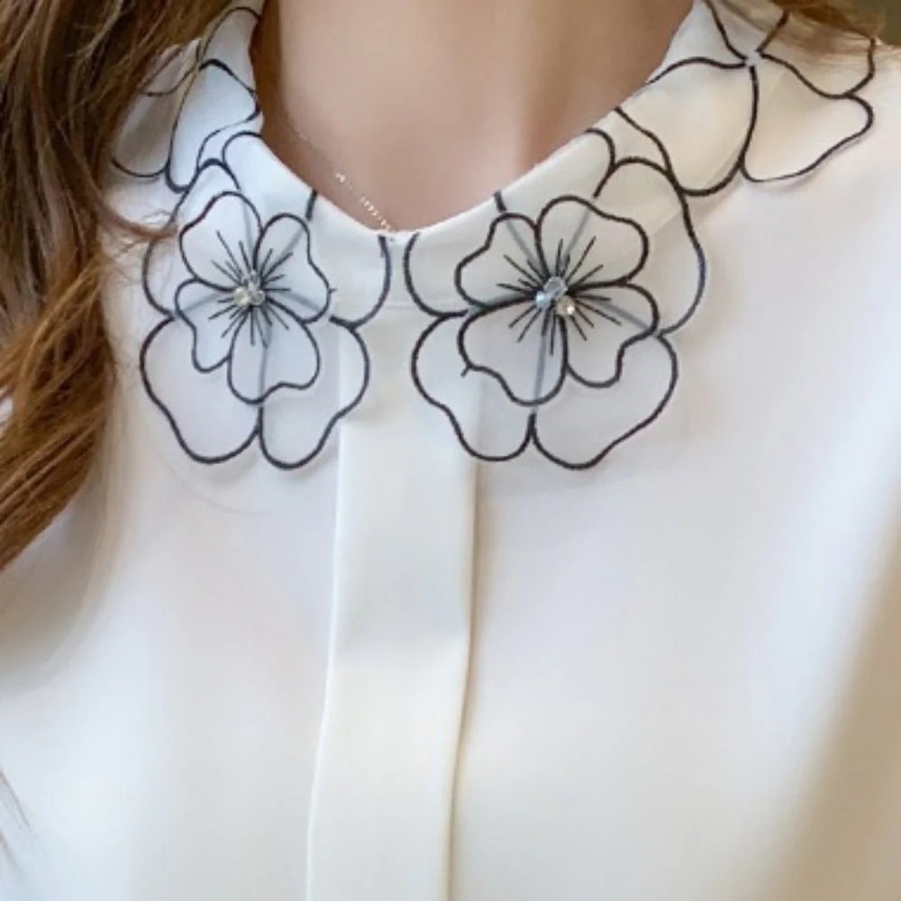 骨格ウェーブ 刺繍襟で華やぐ フラワーデザインブラウス(半袖・長袖 選べる2タイプ)