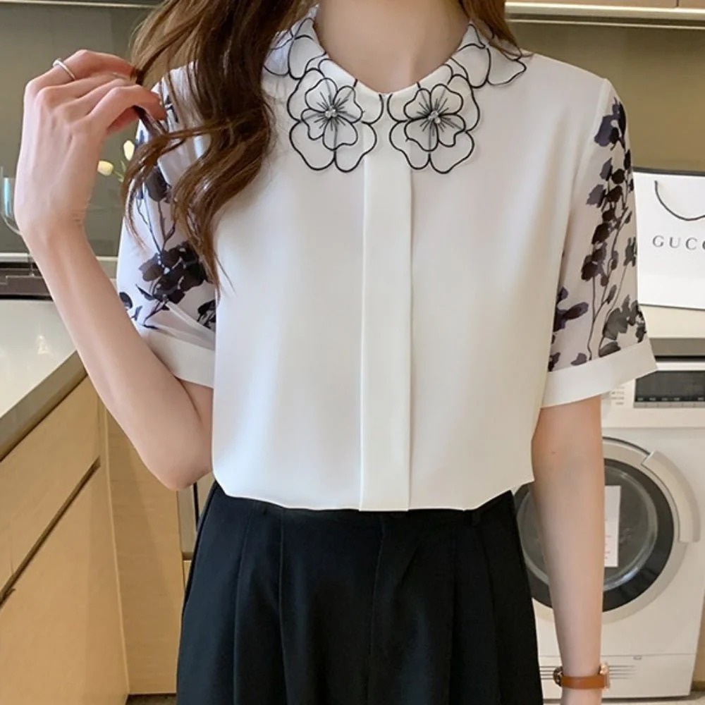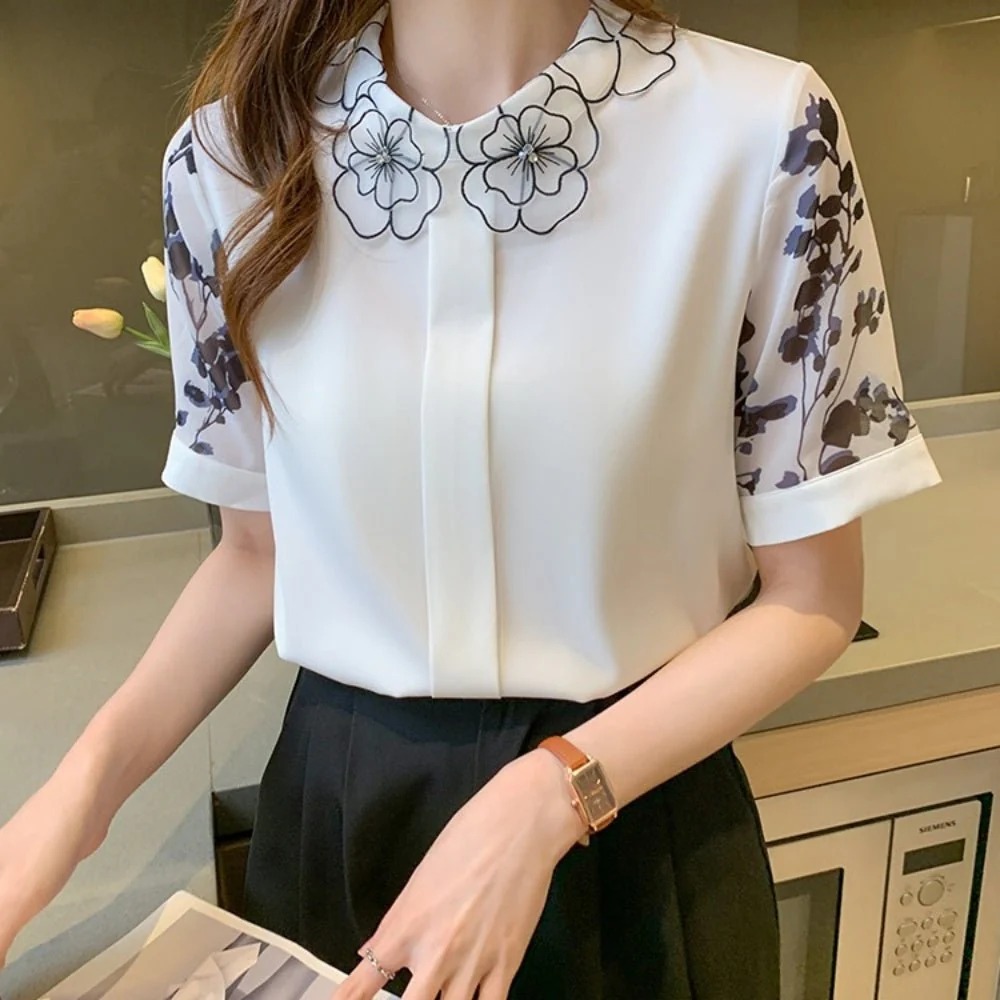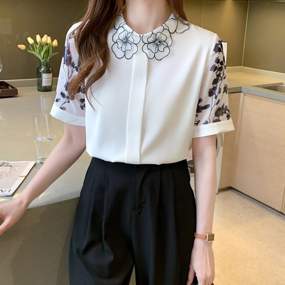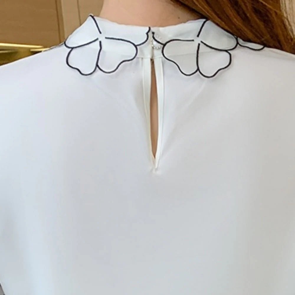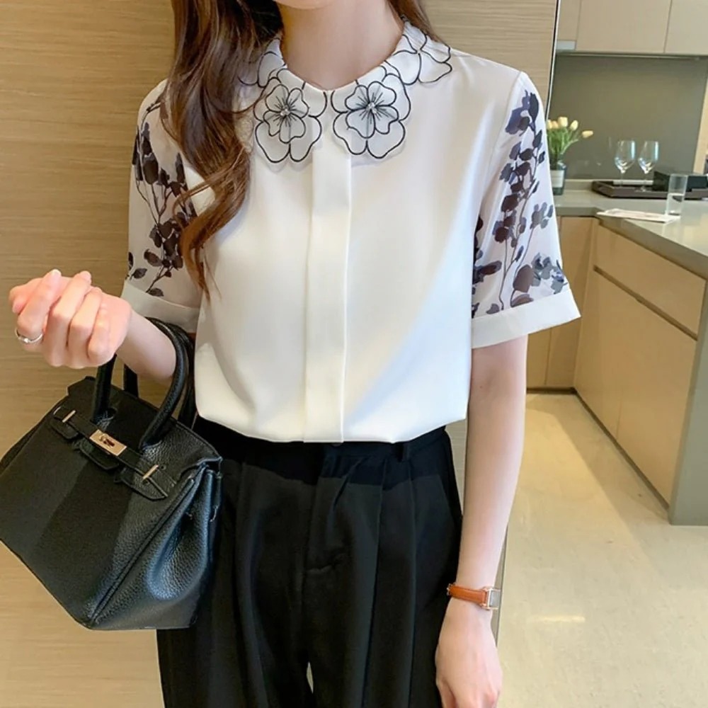 骨格ウェーブ 刺繍襟で華やぐ フラワーデザインブラウス(半袖・長袖 選べる2タイプ)