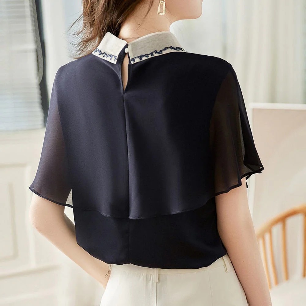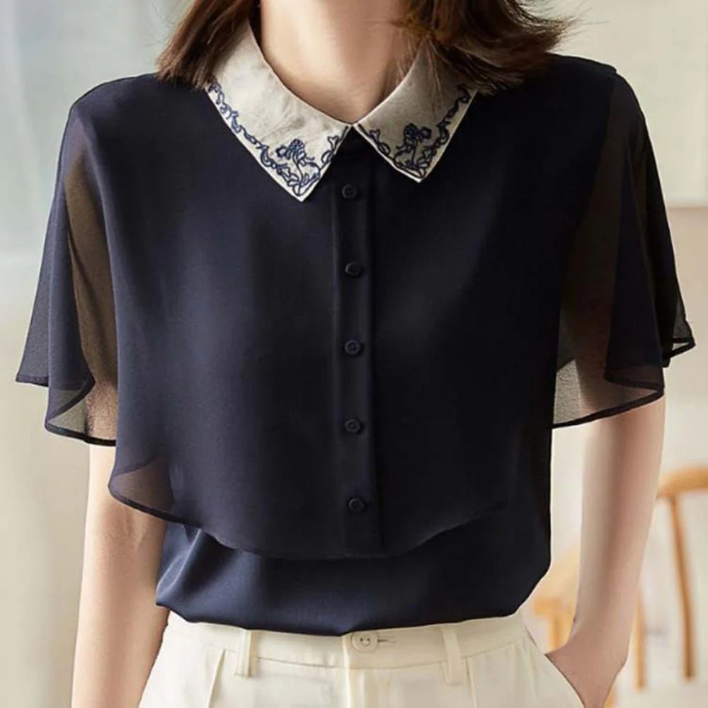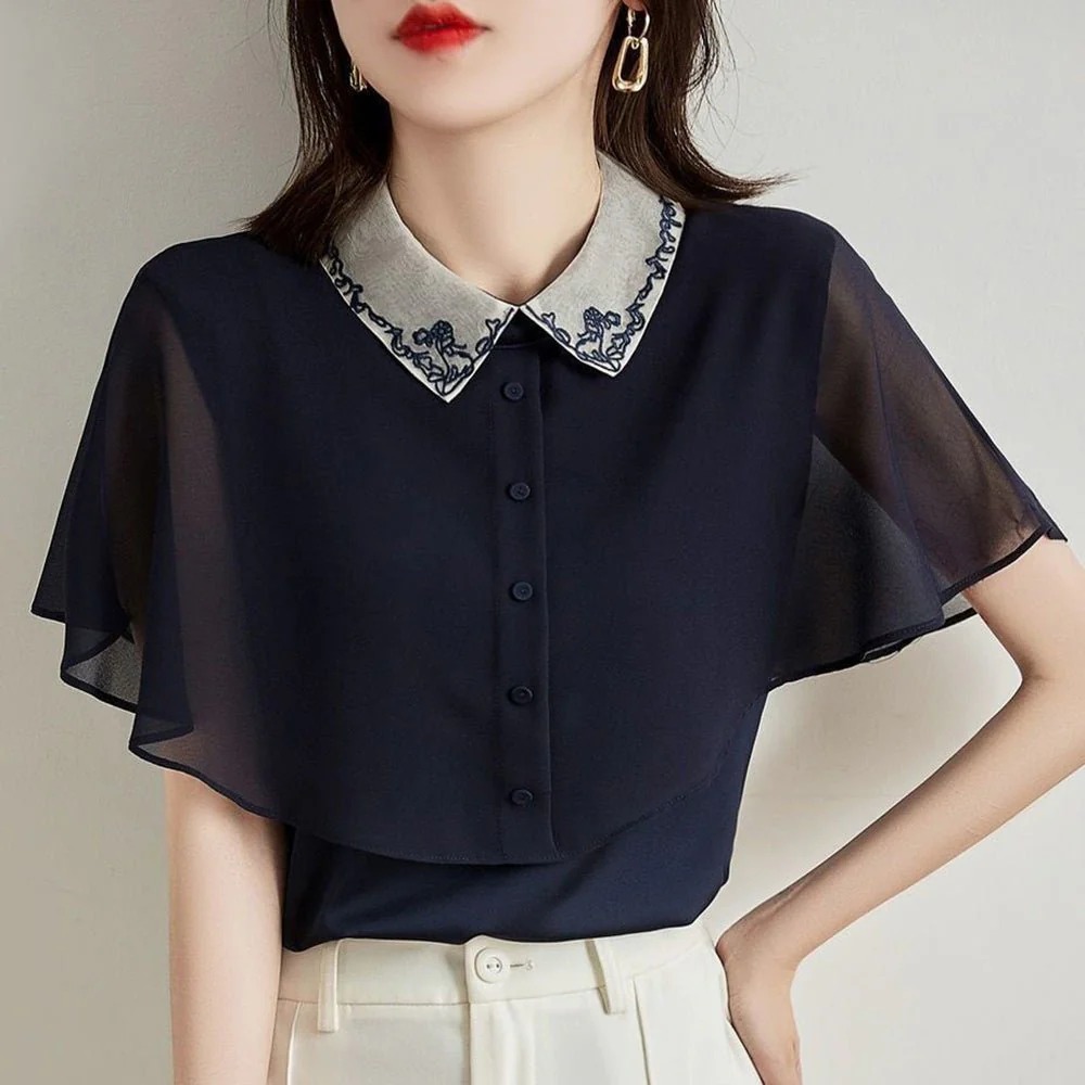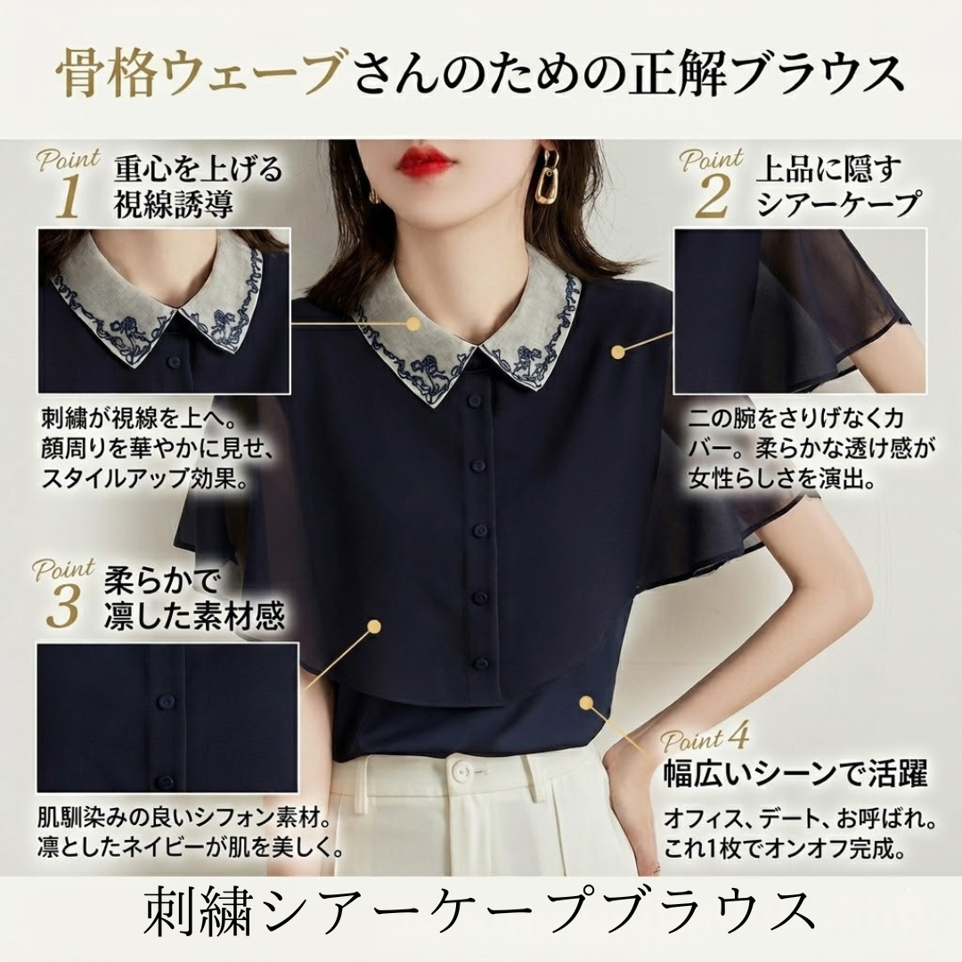 骨格ウェーブ 上品フェミニン 刺繍シアーケープブラウス
