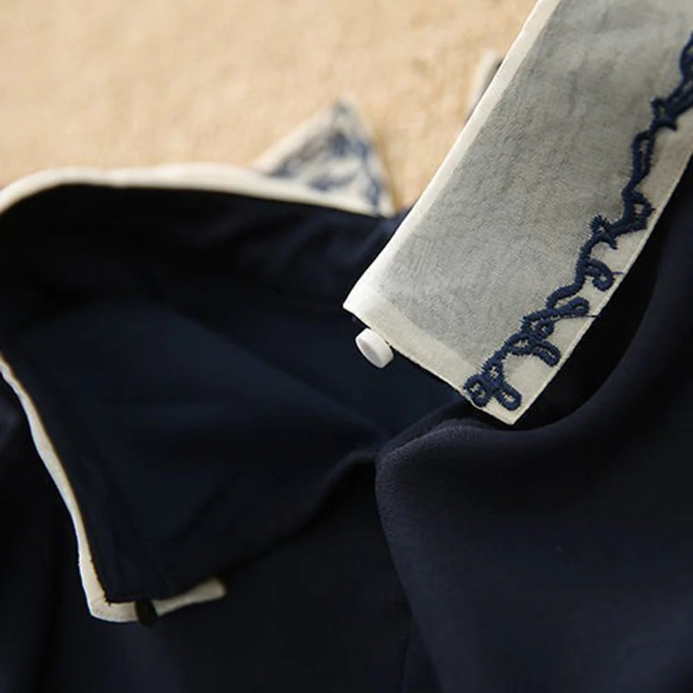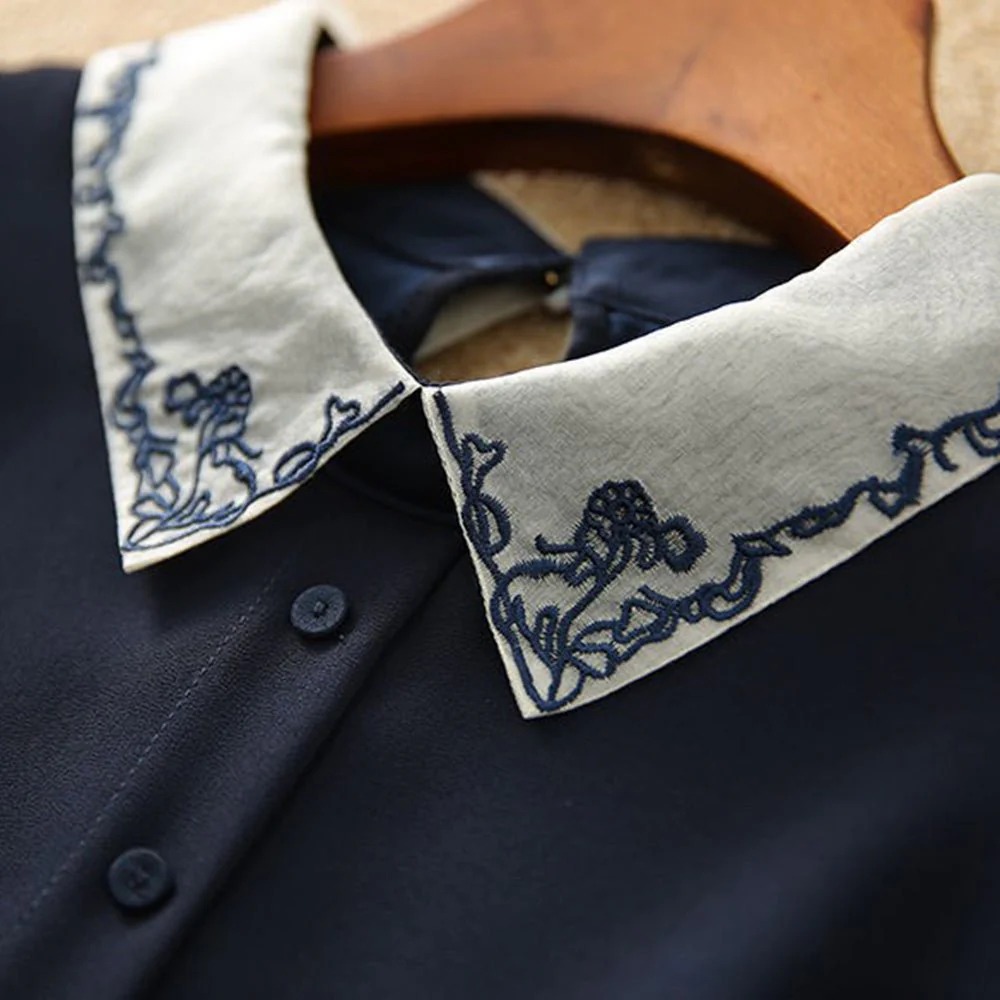 顔まわりに華やかさを添える、刺繍入りの配色襟。