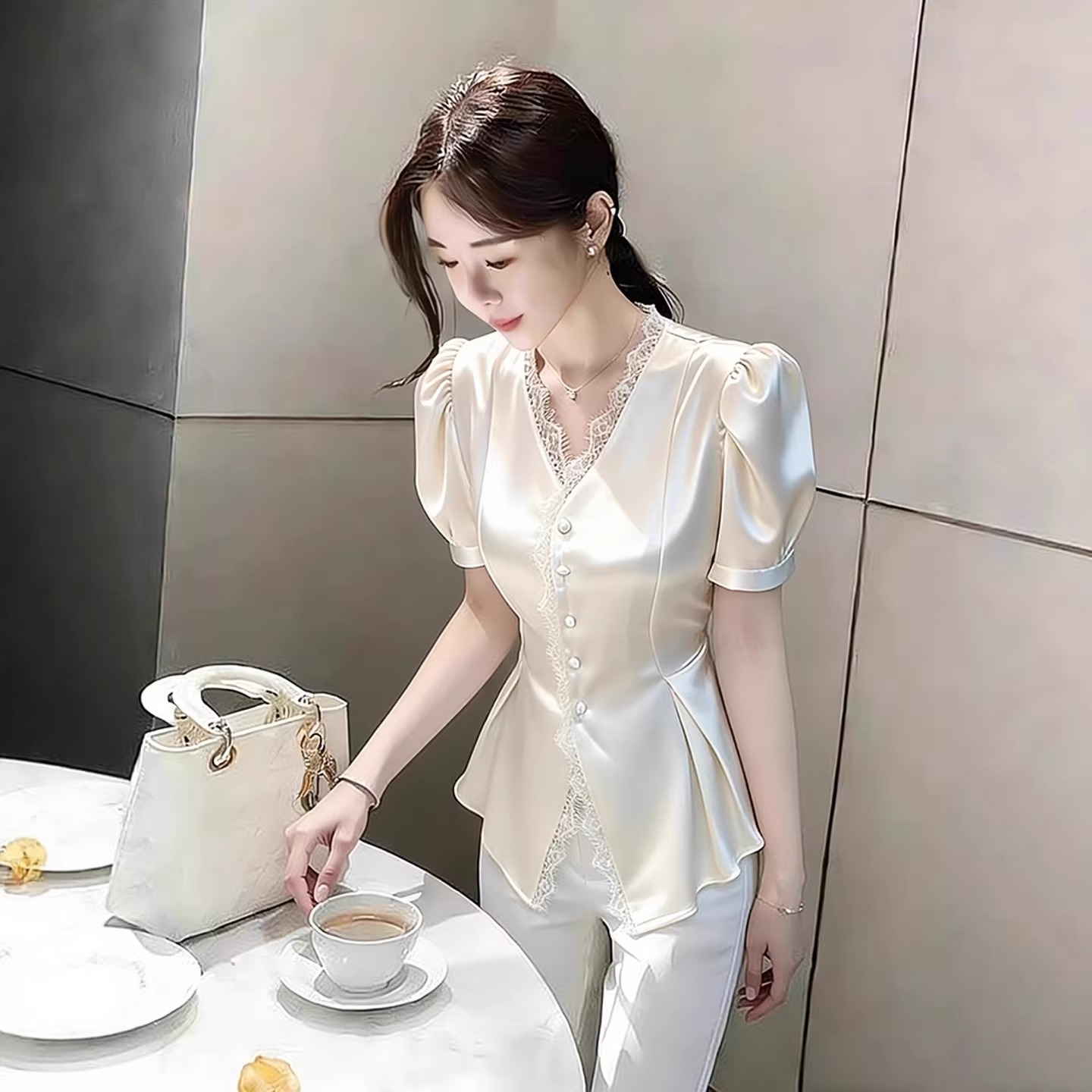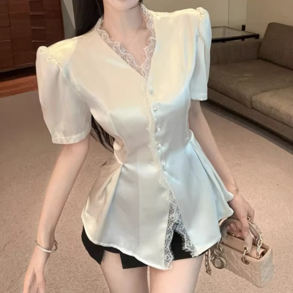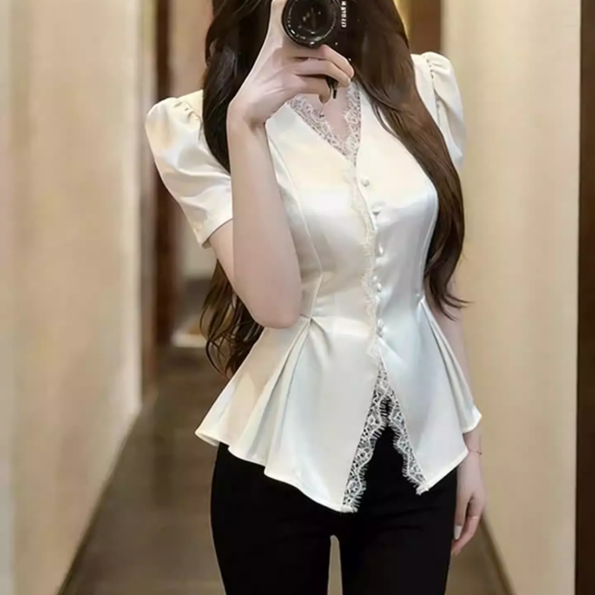 骨格ウェーブ 美くびれペプラム サテンレースブラウス