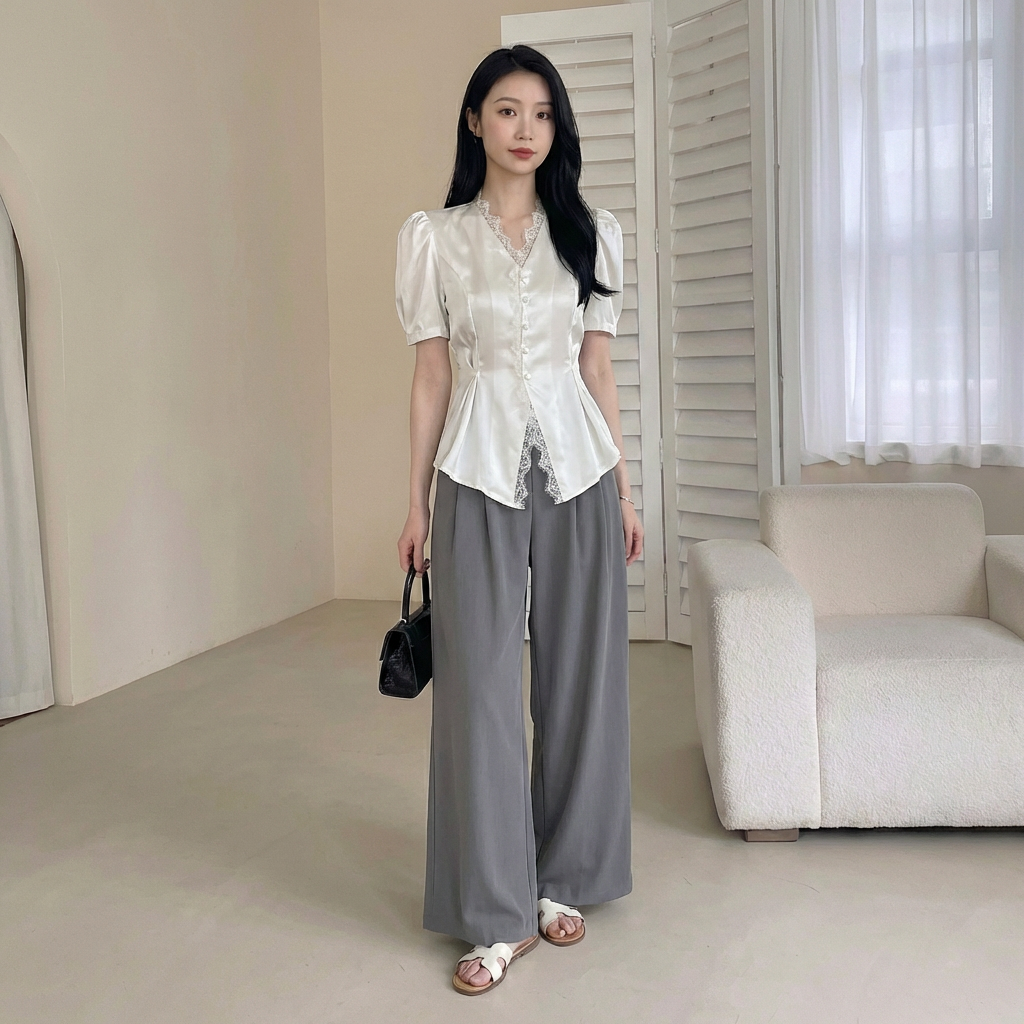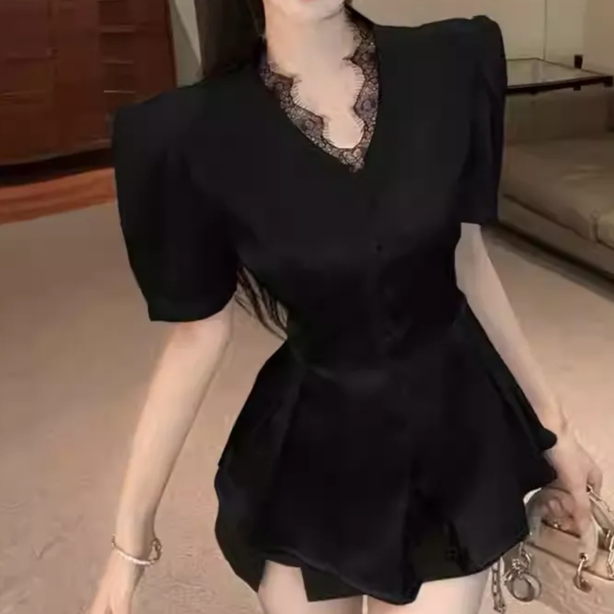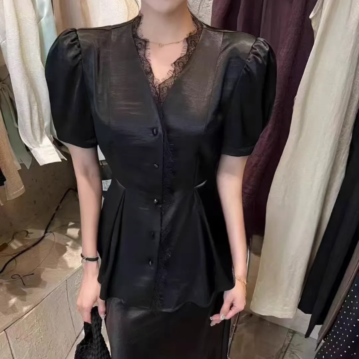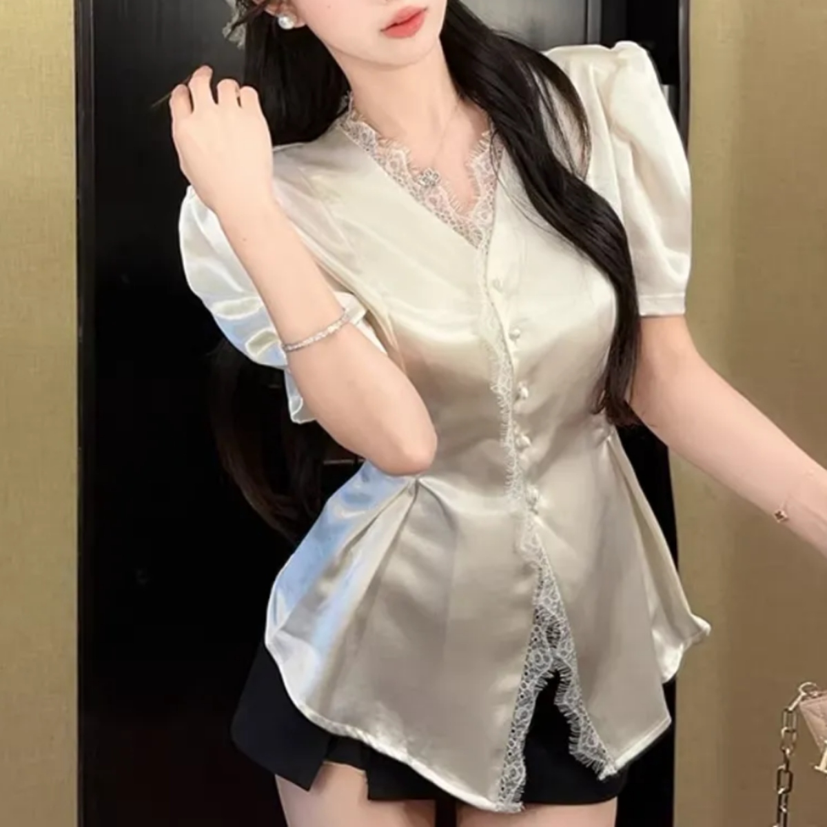 骨格ウェーブ 美くびれペプラム サテンレースブラウス