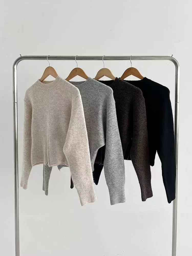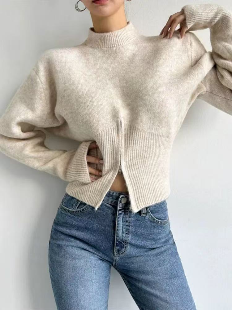 骨格ウェーブ 韓国風 くびれジップデザイン ラウンドネックニット