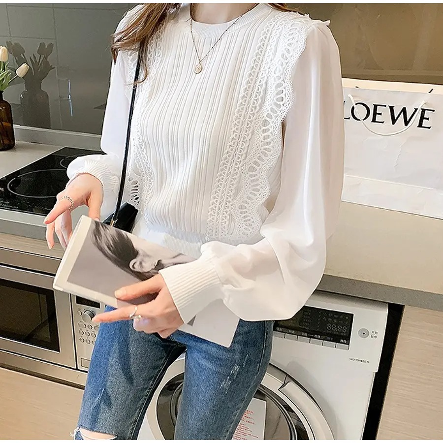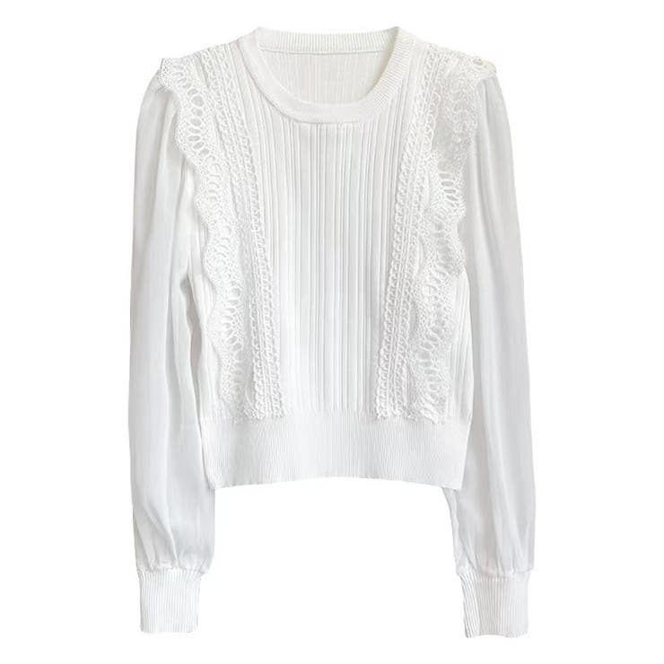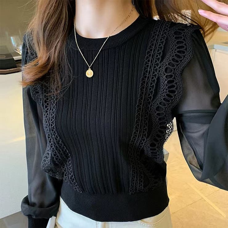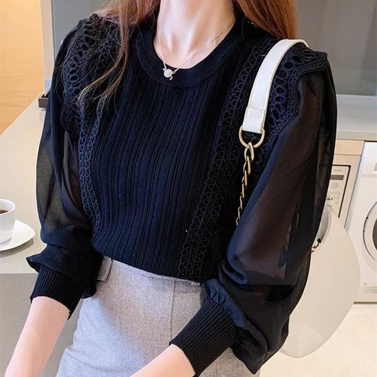 骨格ウェーブ シアー袖 ドッキングニットトップス