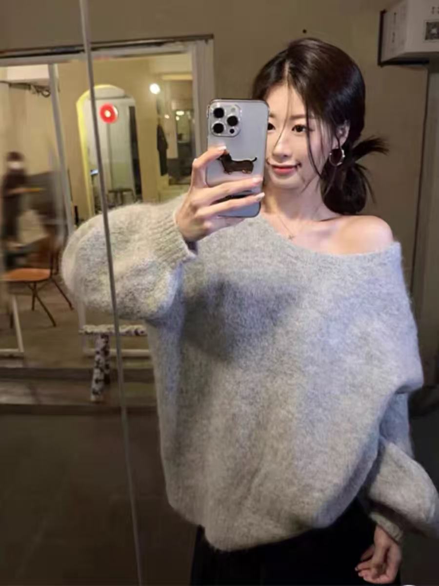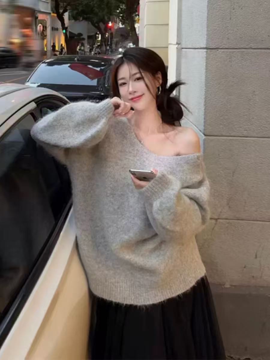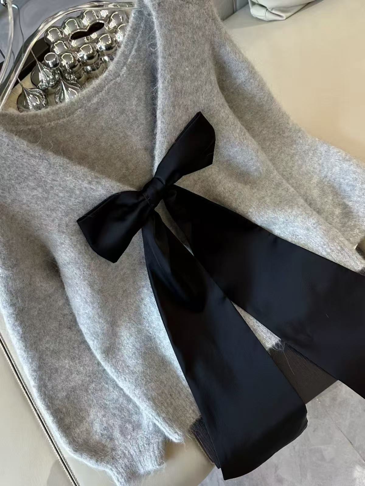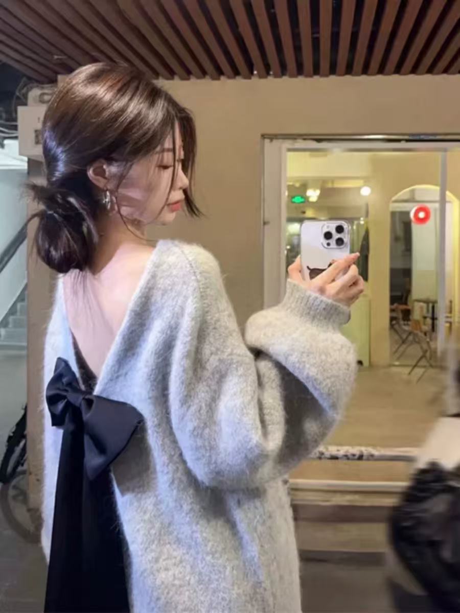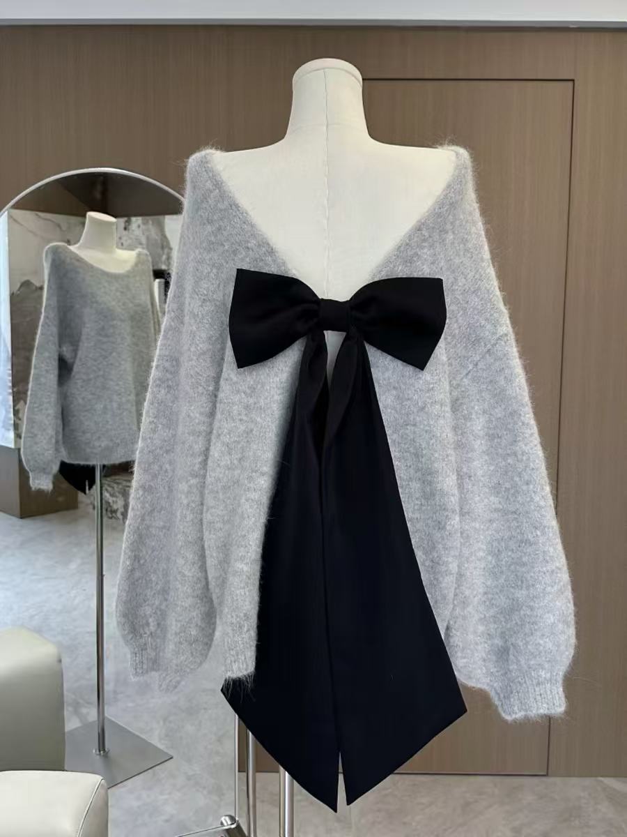 骨格ウェーブ リボン×オープンバック グレーニット 秋冬 長袖 ゆるシルエット