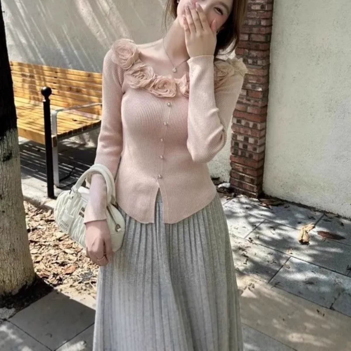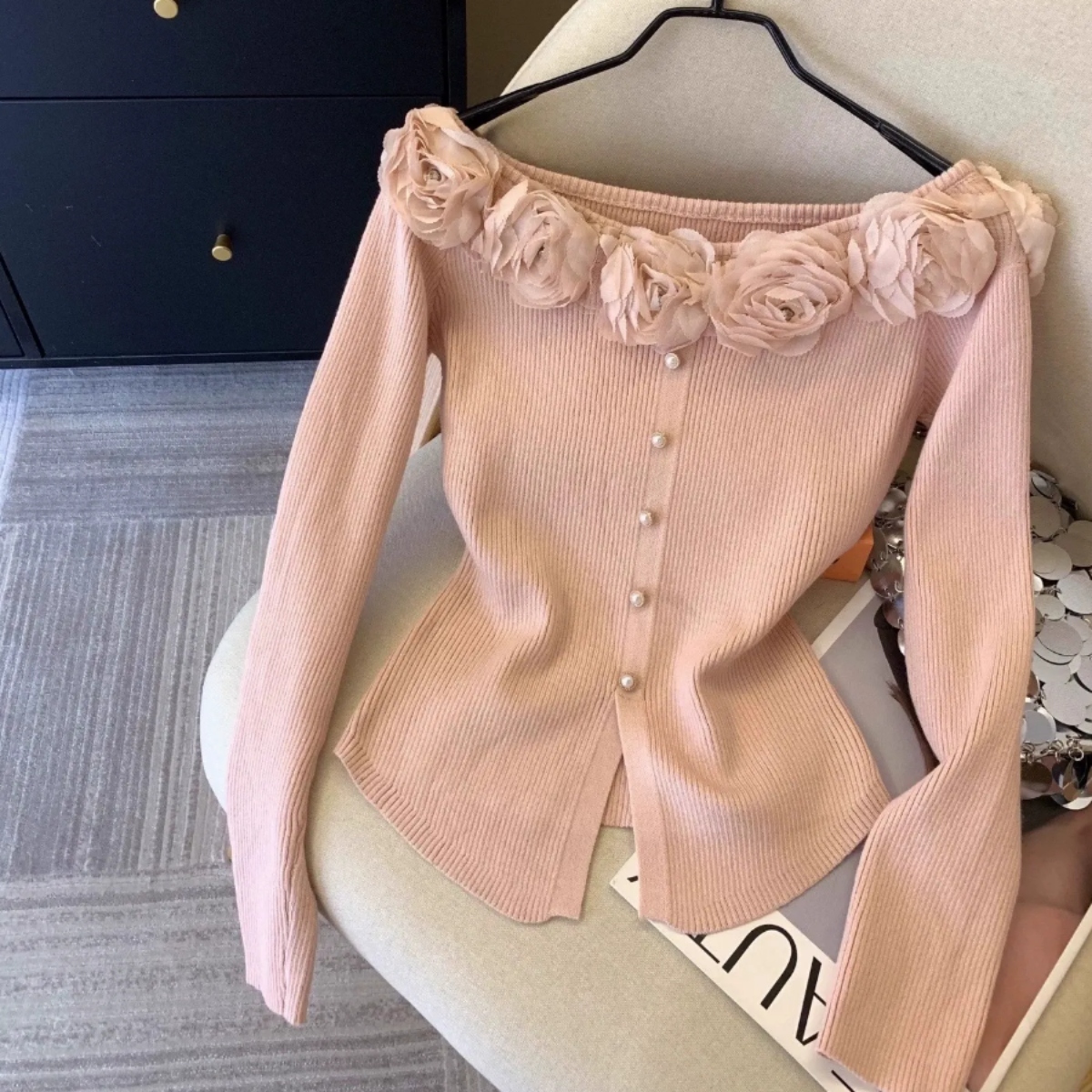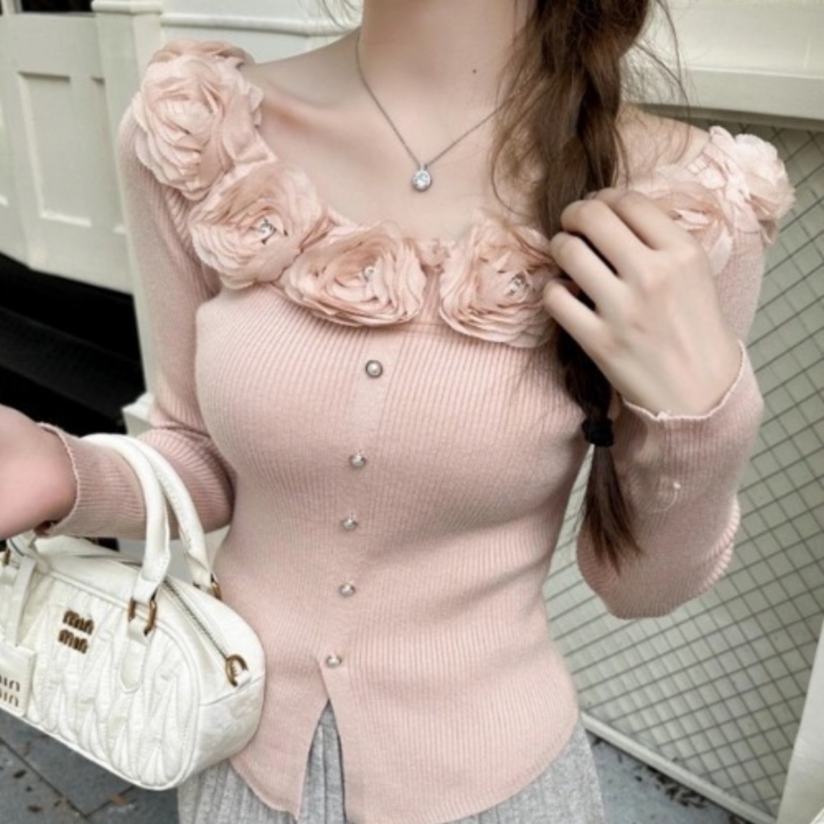 骨格ウェーブ 立体フラワーモチーフ リブニット