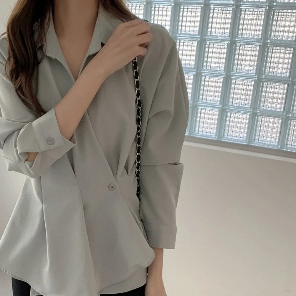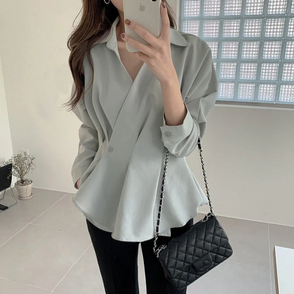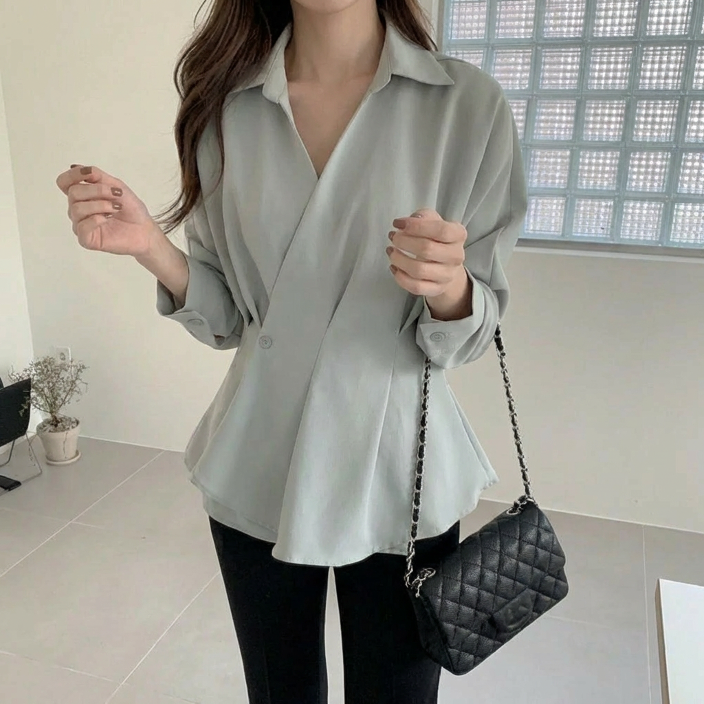 骨格ウェーブさんの柔らかなボディラインを美しく引き立てる、計算尽くされたカシュクールシャツです。