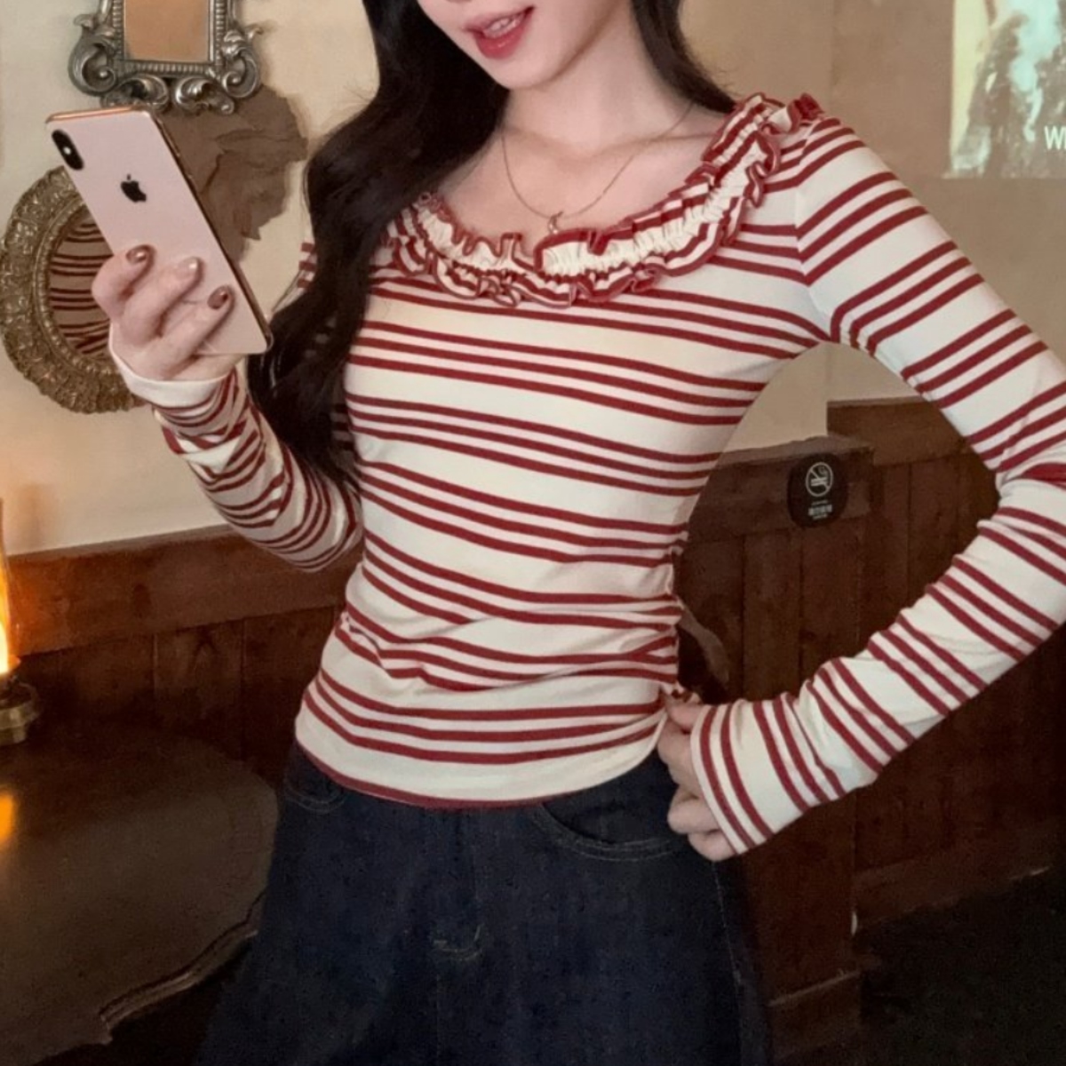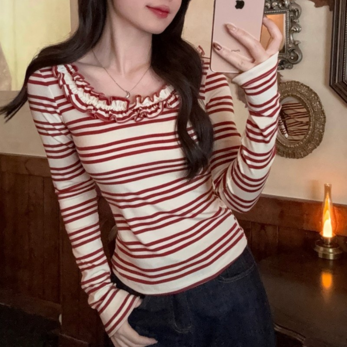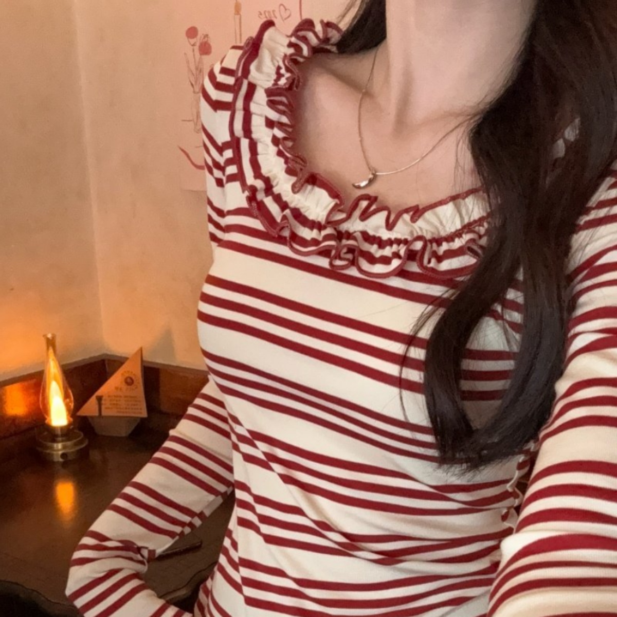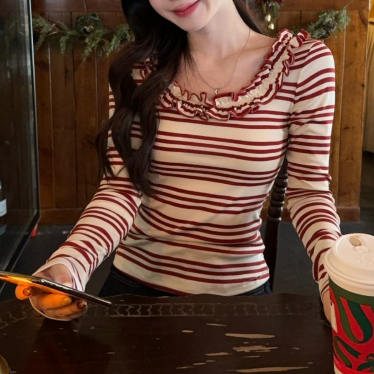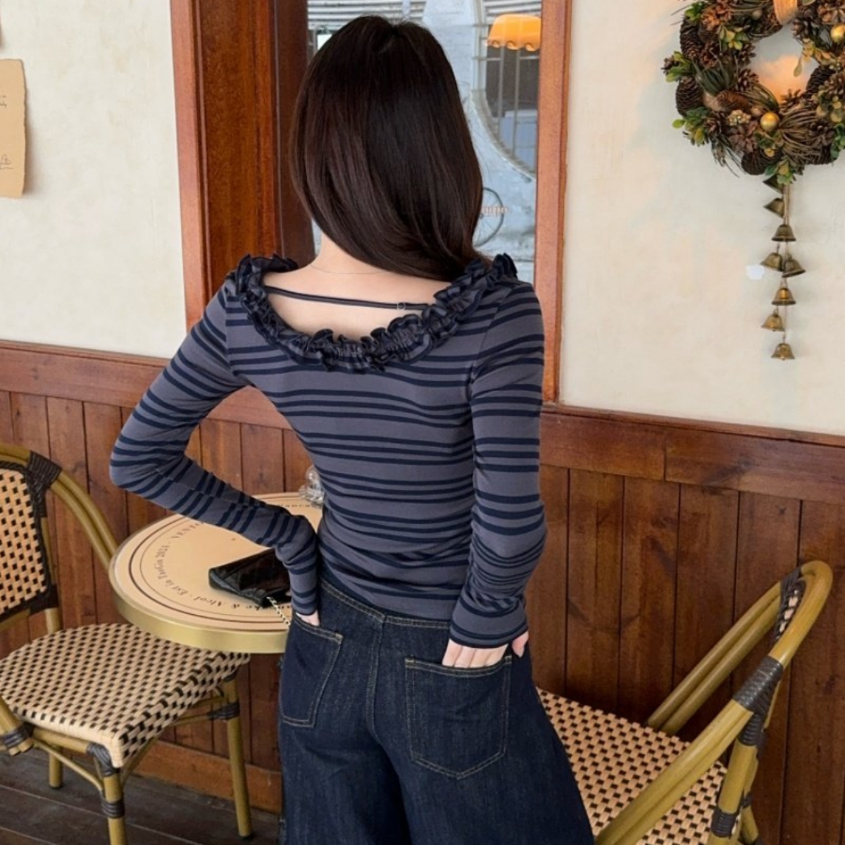 骨格ウェーブさんのために作られたような、計算されたシルエットのボーダートップスが登場。 胸元のフリルが上半身の寂しさを自然にカバーしつつ、大きく開いたネックラインが自慢のデコルテラインを美しく演出します。 体に程よくフィットするリブ素材が、ウェーブタイプ特有の「くびれ」を強調し、着るだけでスタイルアップが叶います。 デートやカフェ巡りなど、写真映えしたい日にぴったりの一枚です。 ハイウエストのマーメイドスカートや、ミニスカートと合わせるとさらに脚長効果がアップします。