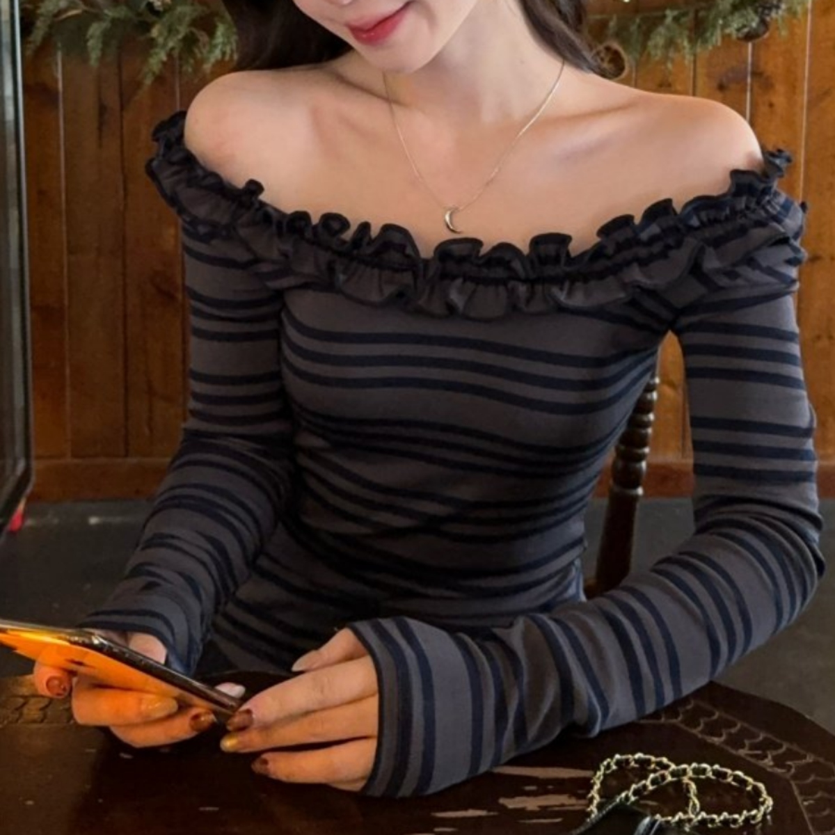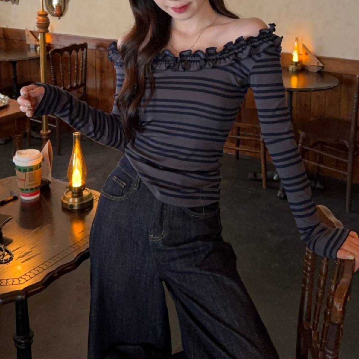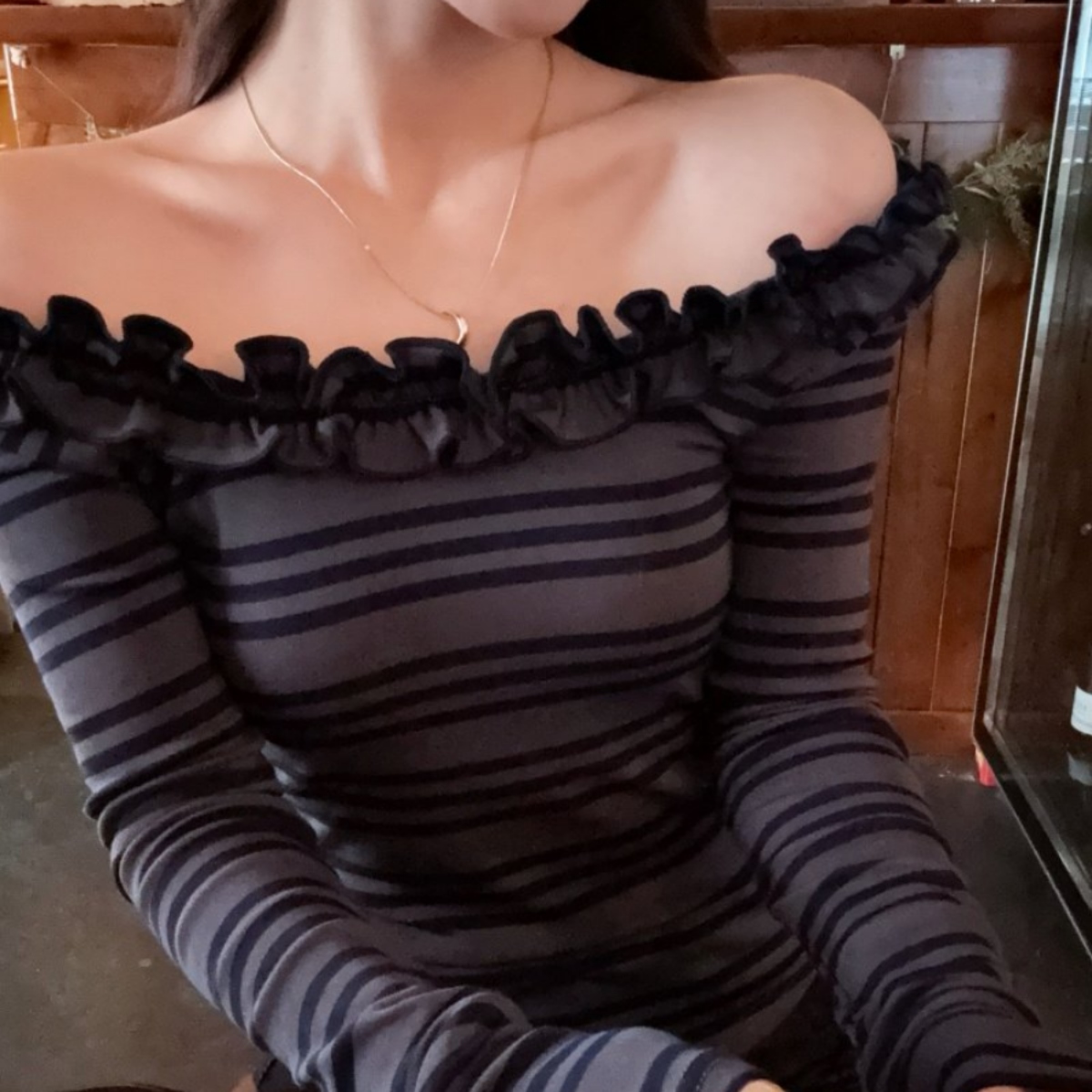 骨格ウェーブ デコルテ華奢見え フリルオフショル ボーダートップス